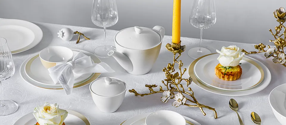Набор для сервировки стола можно дополнить элегантным текстилем. Однотонные изделия или модели с ненавязчивым спокойным узором будут выглядеть вполне уместно. Скатерти испанского бренда Atenas обладают водоотталкивающей пропиткой, поэтому отлично подойдут для использования в загородном доме, а также для семей с детьми.