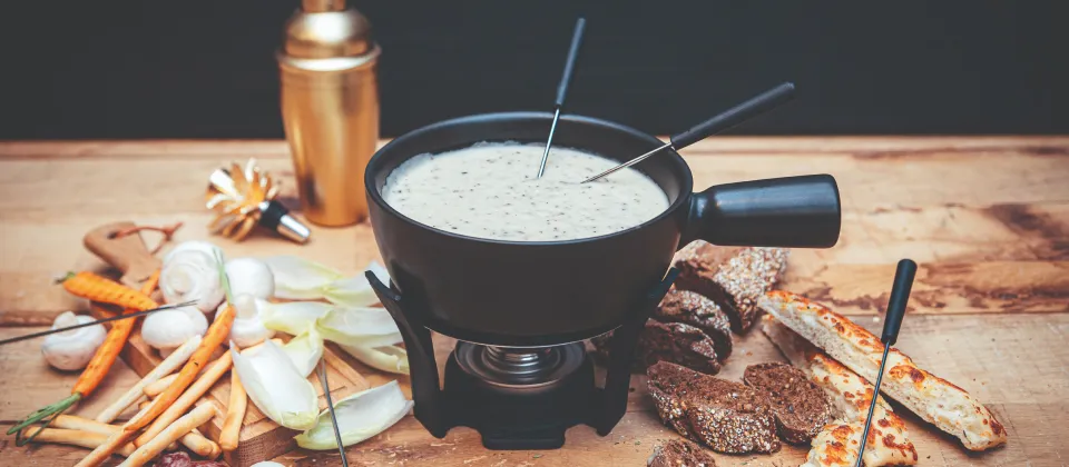 Фондю – отличный вариант ещё и потому что вы угодите каждому. Блюдо можно приготовить как из сыра, так и шоколада. Даже если гости равнодушны к основному блюду, то смогут полакомиться сопровождающими фруктами и апперитивами.