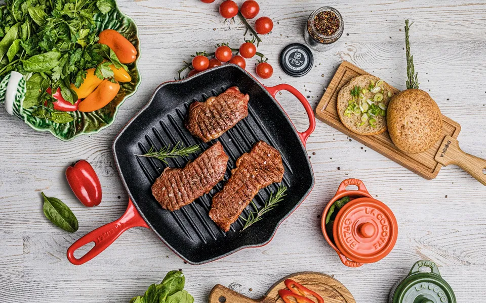 - Для стейков и блюд на гриле, цыплёнка-табака идеально подойдет сковорода-гриль.