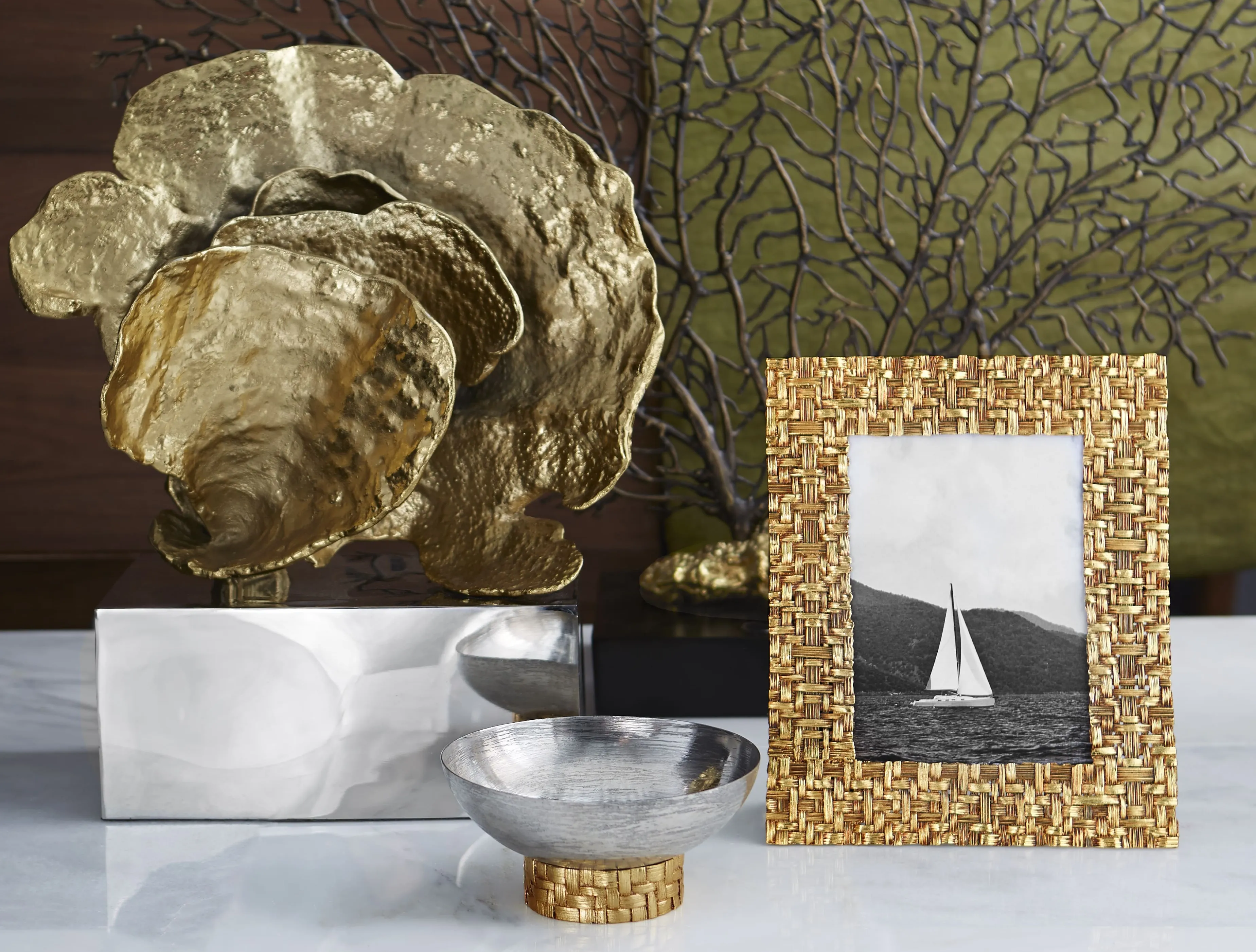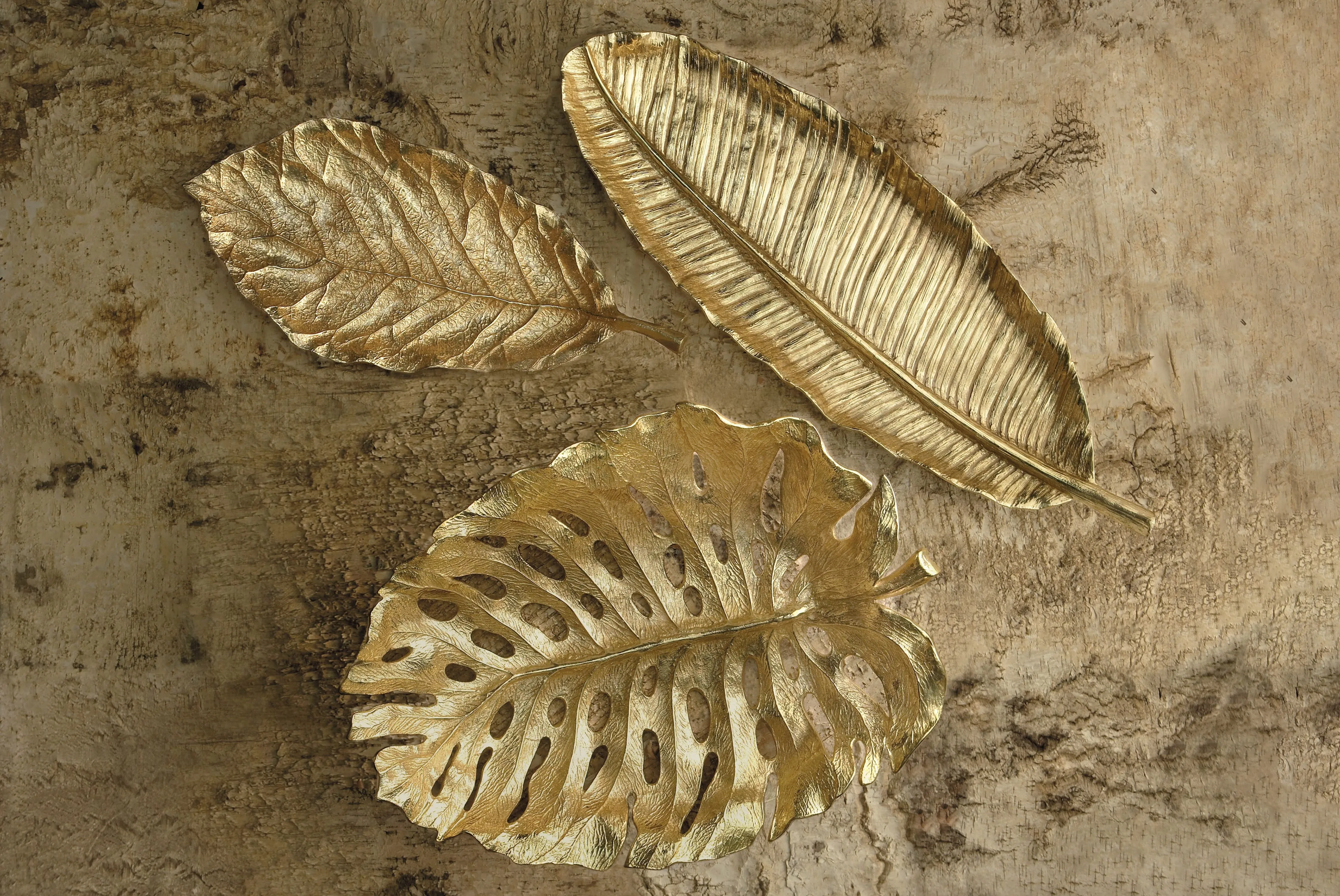 В коллекции представлены блюда для центра стола, рамки для фото, чаши, как будто сплетенные из пальмовых листьев. Изделия выполнены из стали с реалистичной фактурой и покрыты патинированной золотой краской, которая придаёт им антикварный эффект.
