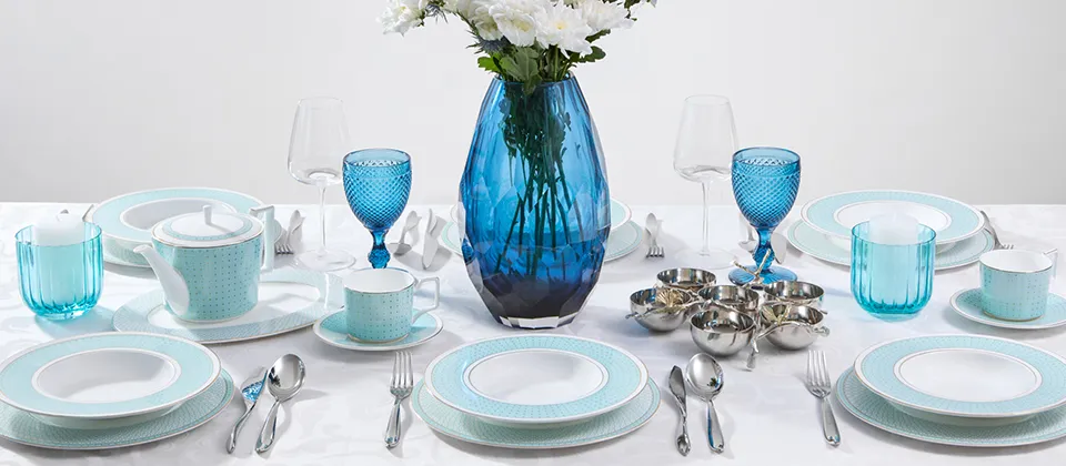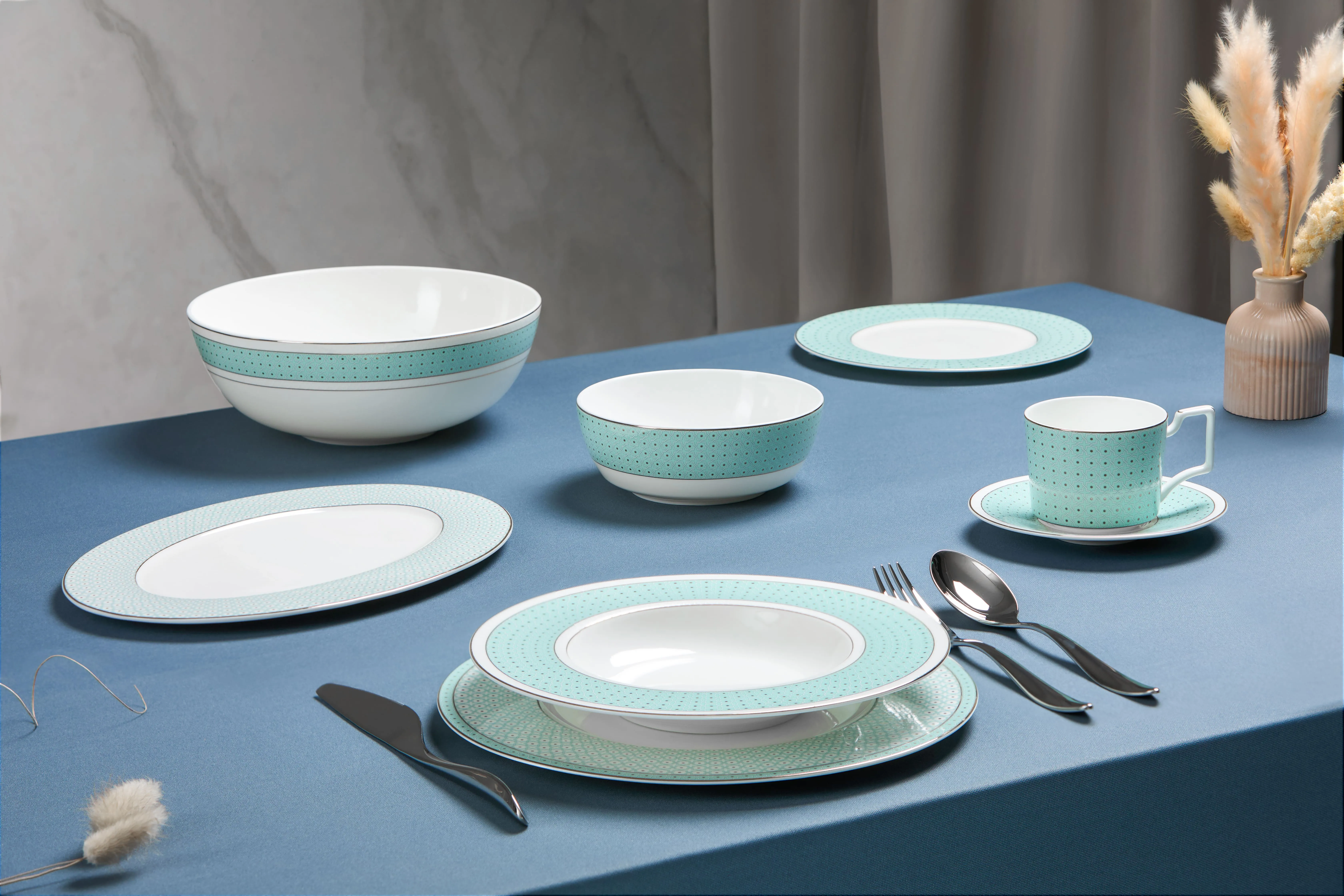 Новая коллекция «Бирюза» от бренда Décor de table – это нежнейший оттенок пастельной палитры, запечатленный на белоснежном фарфоре. Дизайн предметов включает классическое оформление с акцентом на моноцвет. Золотая кайма и такого же цвета точечный декор придает изделиям нарядной элегантности. Посуда изготовлена из костяного фарфора – материала, который известен не только своей белизной и шелковистой фактурой, но и уникальной прочностью. Сервизы и комплекты посуды из этой серии станут замечательным подарком на важное событие: свадьбу, годовщину или юбилей.