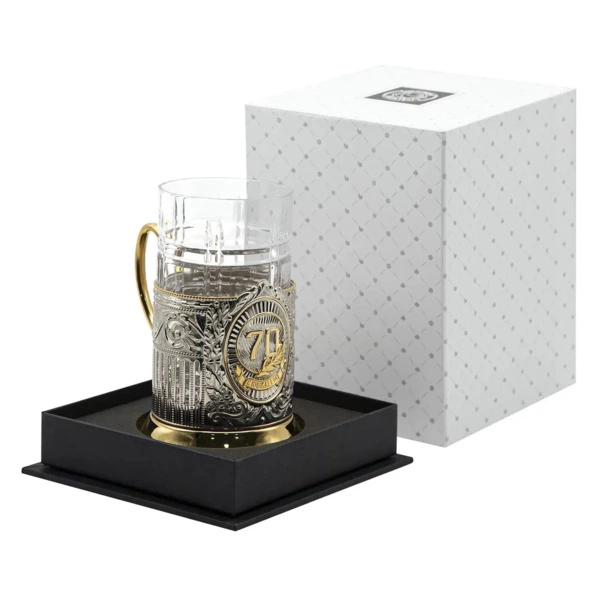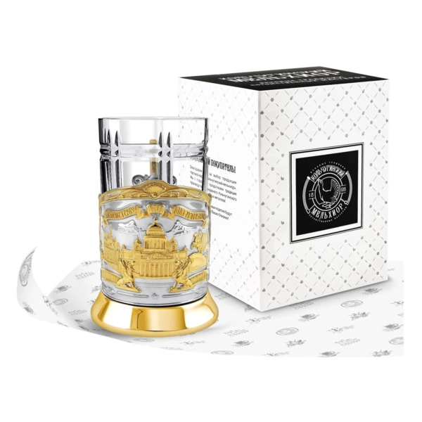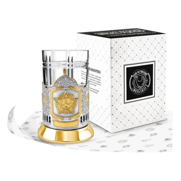 Стакан с подстаканником Кольчугинский мельхиор Орден Победы 2 Герба РФ с чернением и позолотой, лату