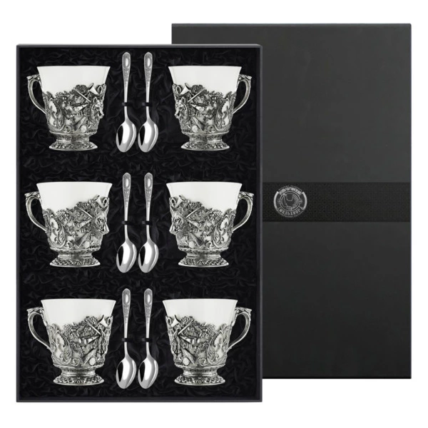 Чашка чайная с ложкой в футляре АргентА Серебро и Фарфор Тетерев 94,65 г, серебро 925