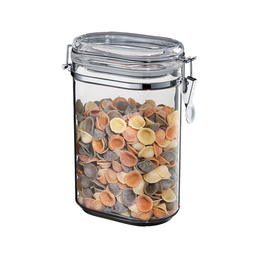 Банка для сыпучих продуктов изготовлена из высококачественного и прочного акрила. Она станет весьма практичным решением для хранения крупы, макаронных изделий, сахара и сухофруктов. Герметичная крышка плотно закрывается и препятствует проникновению влаги и посторонних запахов. Благодаря уникальному замку, она случайно не откроется при переноске или хранении. Прозрачный акрил позволяет увидеть, что находится в банке. Очень удобный практичный и стильный аксессуар для вашей кухни.