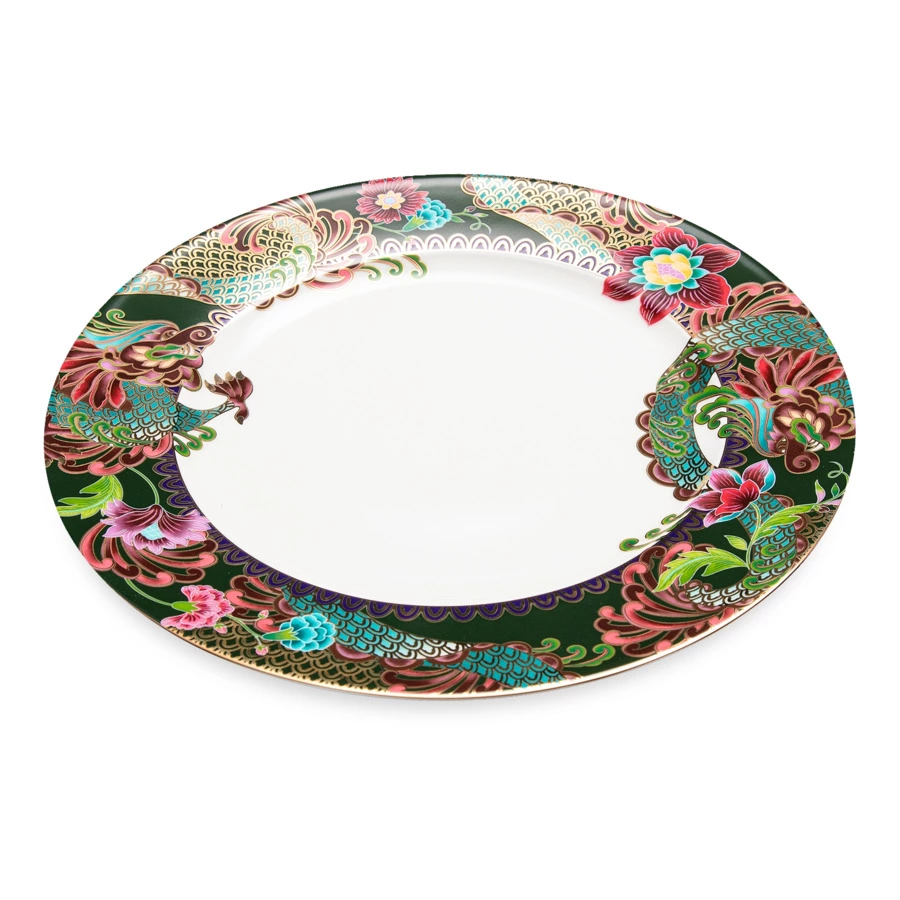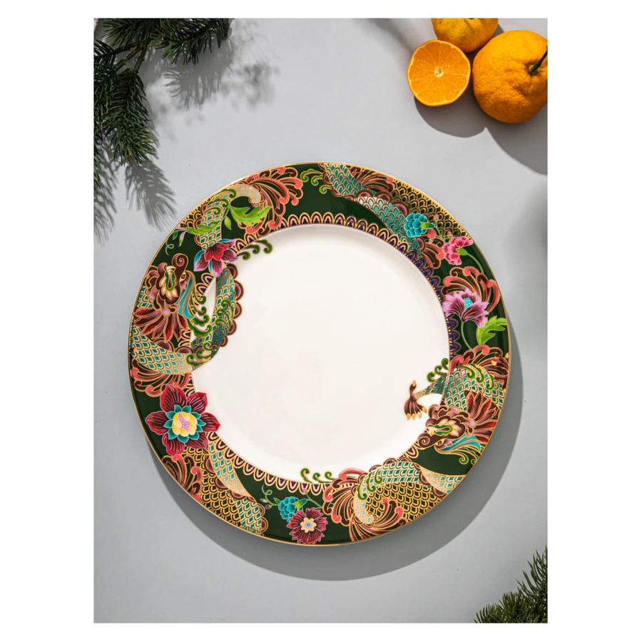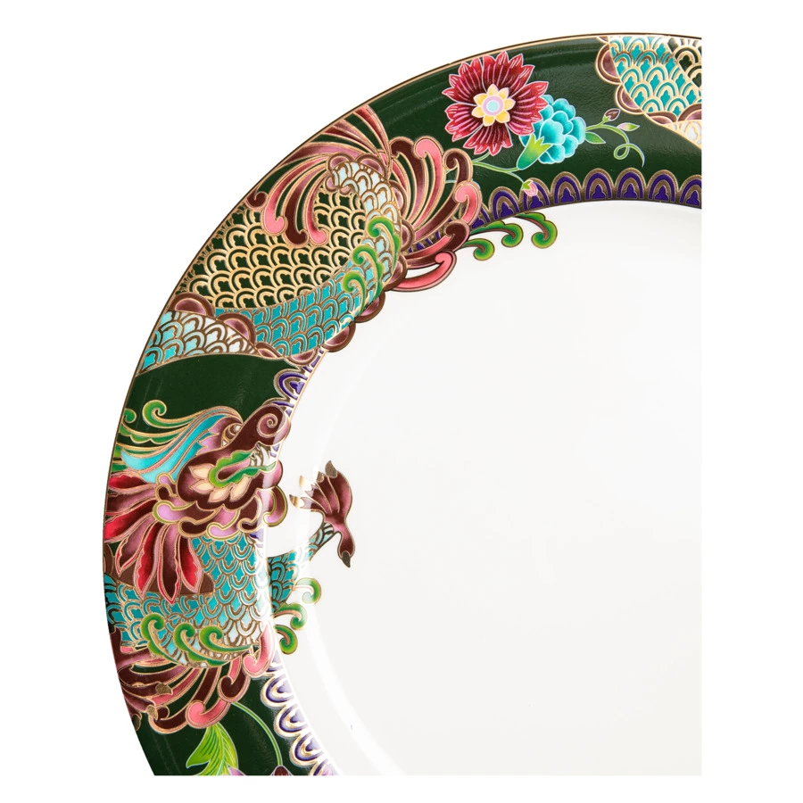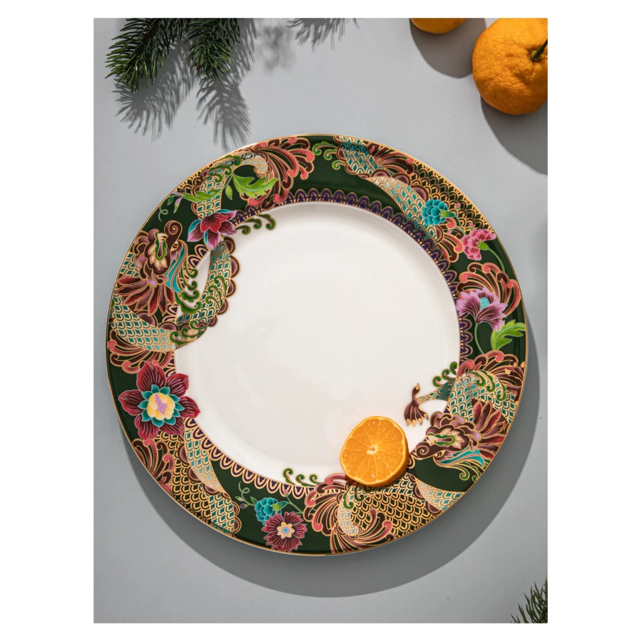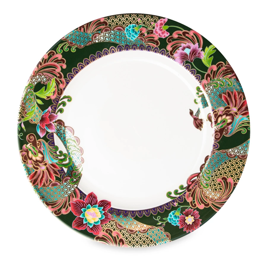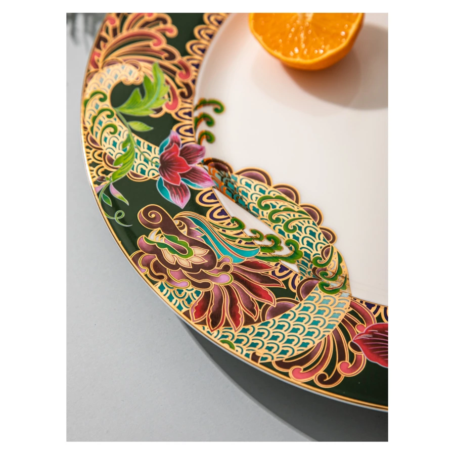 Круглое блюдо из коллекции «Волшебный дракон» от бренда Mix&Match Home украсит собой любую сервировку, но особенно уместно будет смотреться на новогоднем столе. Изделие можно преподнести в качестве подарка на Новый год, ведь по восточному календарю символом наступающего 2024 года будет как раз зелёный дракон. Фарфоровое блюдо можно использовать для подачи закусок, фруктов или мини-десертов. Бортик тарелки декорирован красочным орнаментом в изумрудно-зелёных, лазурных и розовых тонах. Центральная часть выполнена в молочно-белом цвете, поэтому блюдо можно легко сочетать с другой однотонной посудой.