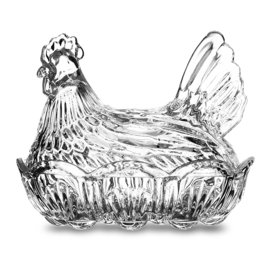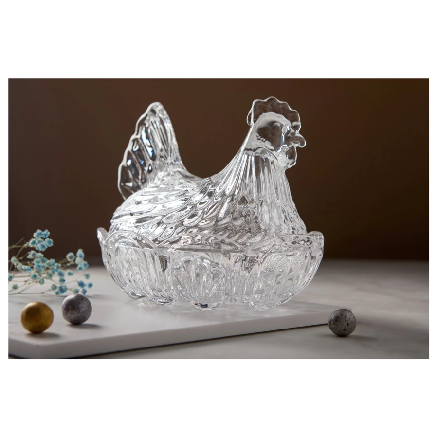 Необычное стеклянное блюдо «Курочка» станет идеальным подарком на Пасху. Модель рассчитана на подачу 10 яиц и состоит из двух частей: основания и крышки, выполненной в виде курочки-несушки. Искусная огранка придает предмету нужные очертания и фактуру. Блюдо от Decor de table, изготовленное из абсолютно прозрачного стекла, станет главным украшением сервировки праздничного завтрака. Его можно также использовать в качестве декора интерьера кухни. Особенно гармонично изделие будет смотреться в стилистике кантри или прованс.