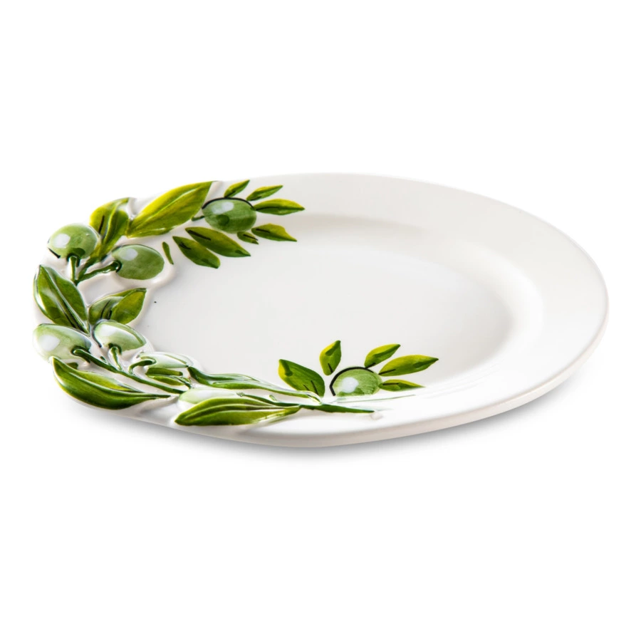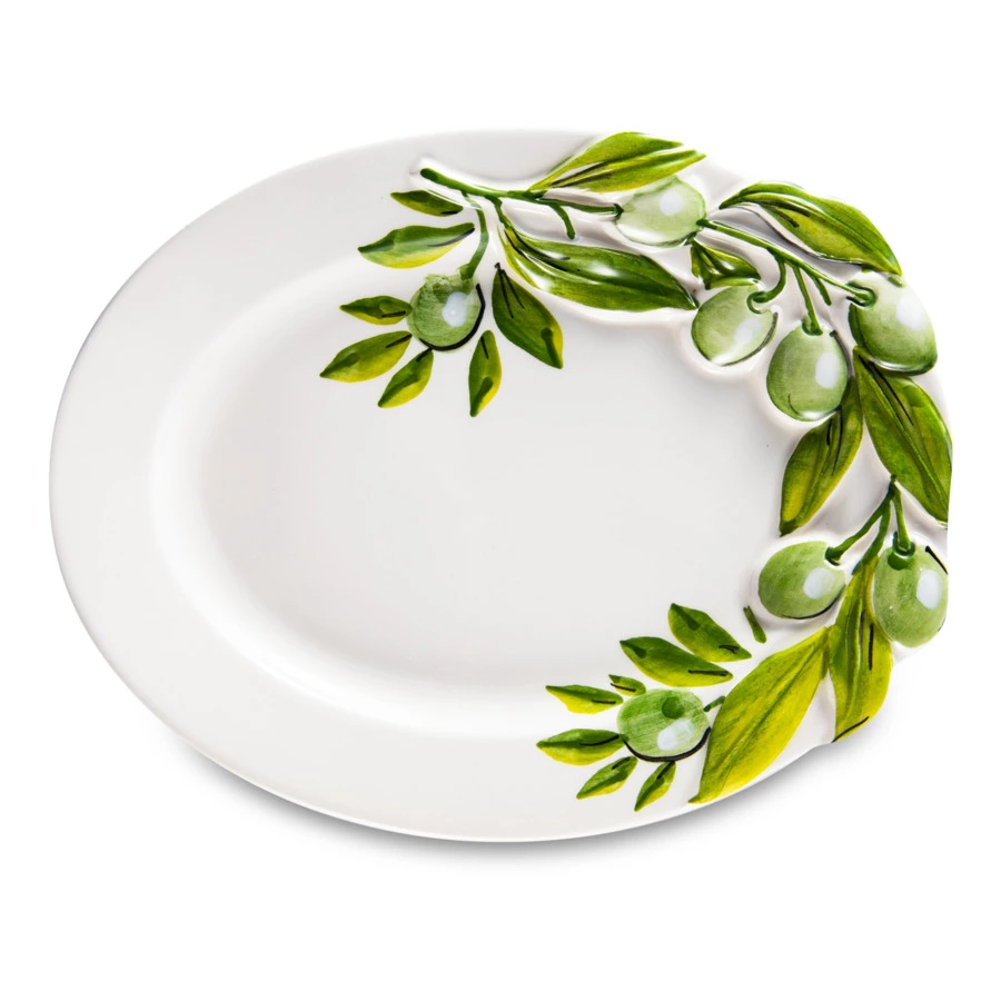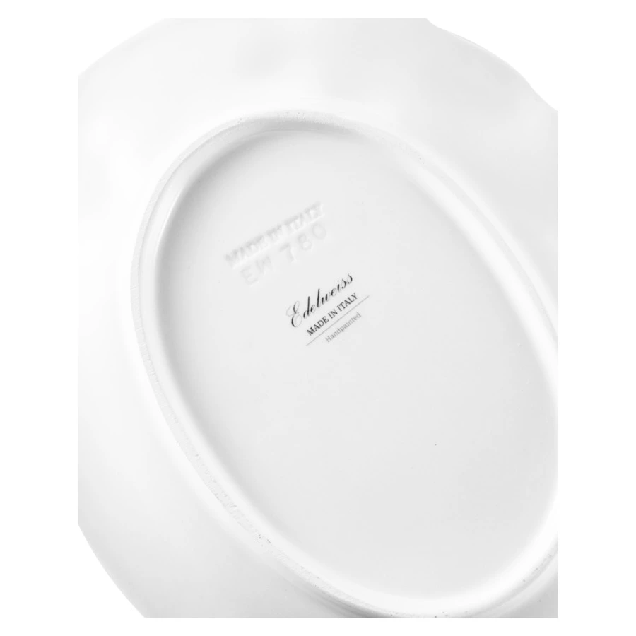 Овальное блюдо из коллекции «Оливки» итальянского бренда Edelweiss впечатляет красочным декором. Изделие по краю украшено расписанным вручную объёмным рисунком. Оливковая ветвь, выполненная в зелёных тонах, эффектно контрастирует с белоснежным фоном. Модель размером 22,0х14,0х2,0 см изготовлена из экологичной керамики. Технология двойного глазурования придает поверхности глянцевый блеск, защищает от впитывания запахов и окрашивания.