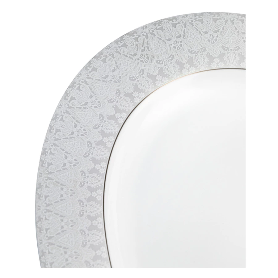 Коллекция посуды «Аврора жемчуг» от японского производителя Narumi – роскошный комплект, подходящий и для сервировки праздничного стола, и для повседневного использования. Рисунок в виде тонкого кружева идеально дополняет лаконичные силуэты, придает утончённость и воздушность. Серебристая обводка завершает элегантный дизайн, добавляя посуде деликатную нарядность.