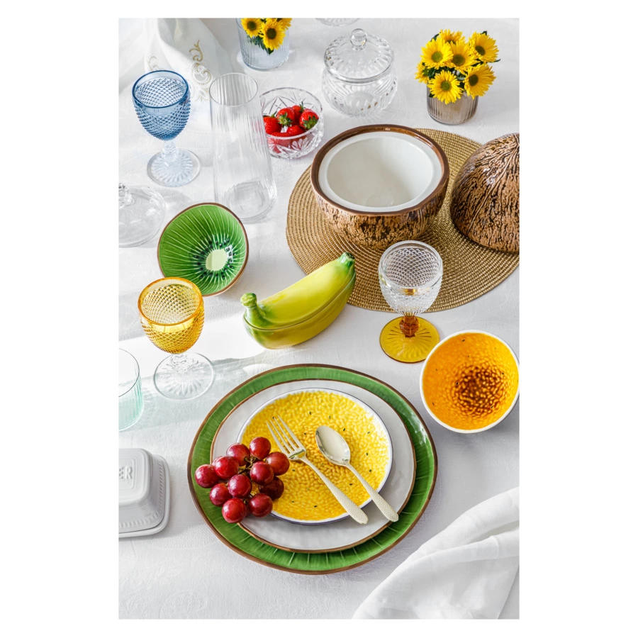 Различные части этого растения — от тёмной грубой коры до больших зелёных листьев и плодов банана превратились в большие салатники и маленькие чаши, менажницы и оригинальные блюда для центра стола. Мастерски исполненная коллекция «Банановая Мадейра» от Бордалло Пинейро, в полной мере воссоздаёт атмосферу тропиков на вашем столе.
