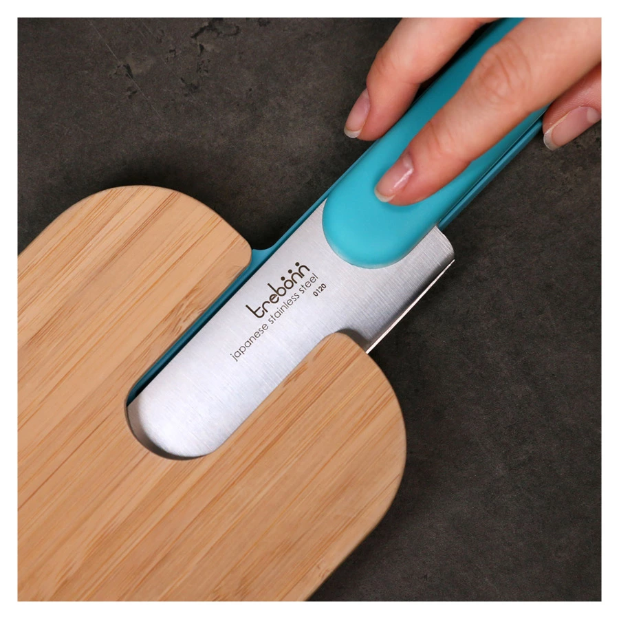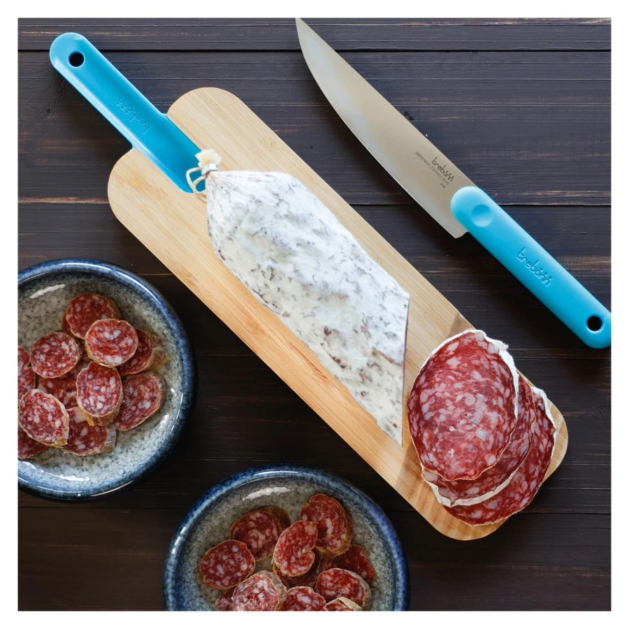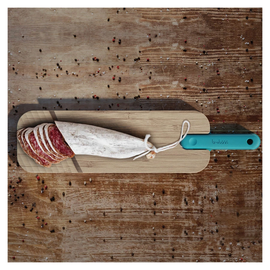 Инновационная разделочная доска со встроенным ножом от итальянского бренда Trebonn приятно удивит вас своим лаконичным дизайном и функциональностью. Изделие разрабатывалось специально для правильной подачи салями, но может использоваться для шинковки любых продуктов. Точность нарезки обеспечат диагональные бороздки, занимающие четвертую часть доски. Модель выполнена из натурального бамбука, известного своей высокой устойчивостью к влаге, химии и механическим воздействиям. Нескользящее основание обеспечивает устойчивое положение на столешнице. Нож для нарезки изготовлен из прочной японской нержавеющей стали. Нескользящая ручка из ABS-пластика гарантирует безопасность в использовании, а магнитный замок надежно фиксирует нож в конструкции доски.