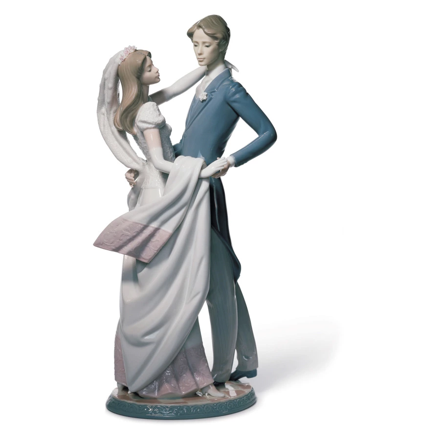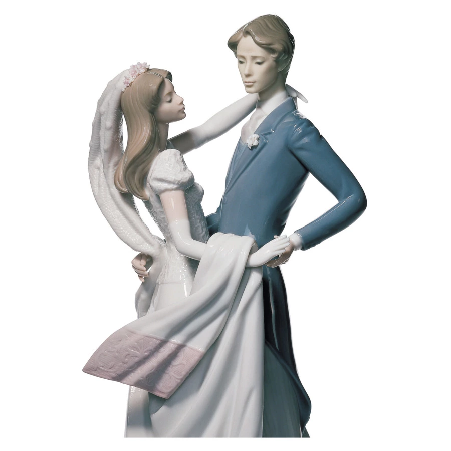 Фигурка из коллекции «Истории любви» станет замечательным подарком на свадьбу или годовщину этого события. Статуэтка олицетворяет собой искреннюю и чистую любовь, надежды на безоблачную совместную жизнь. Глядя на неё, вы будете вспоминать самые счастливые моменты. Изделие изготовлено из высококачественного фарфора. В росписи используются пастельные оттенки голубого, розового, бежевого и молочно-белого. Работа испанского бренда отличается чёткой детализацией: цветок на лацкане жениха, складки на фате невесты, вышивка на корсете и подоле платья выглядят очень правдоподобно.