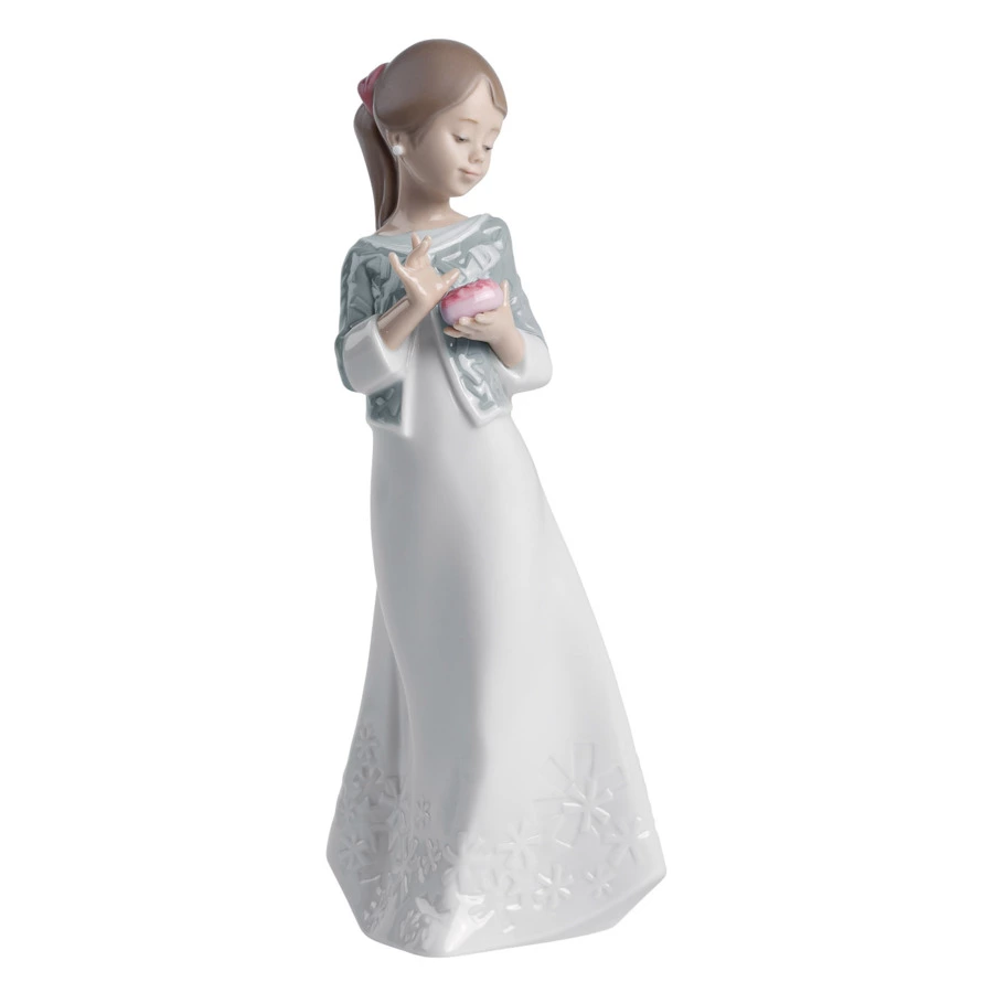 В серию «Юность» входит эстетичная фигурка из фарфора «Подарок от души». Девочка в белом платье с накидкой радостно держит в руках маленький презент. Статуэтка будет уместно смотреться в кабинете, спальне или детской комнате.