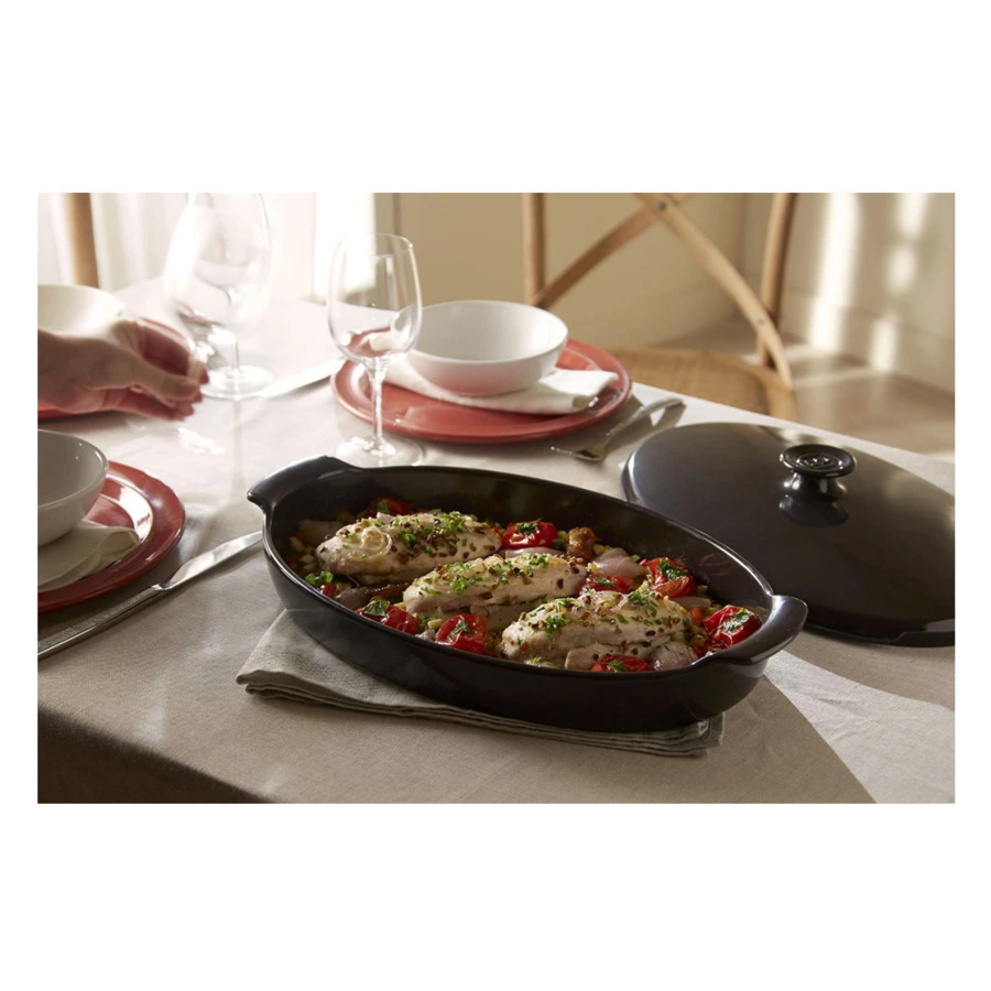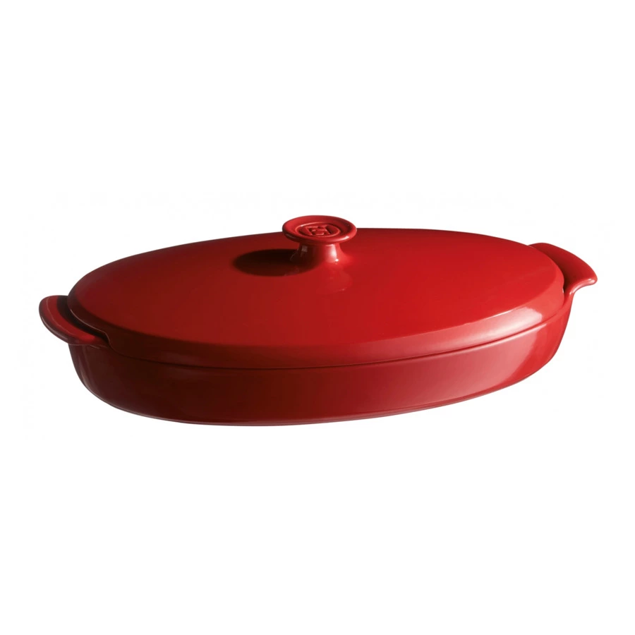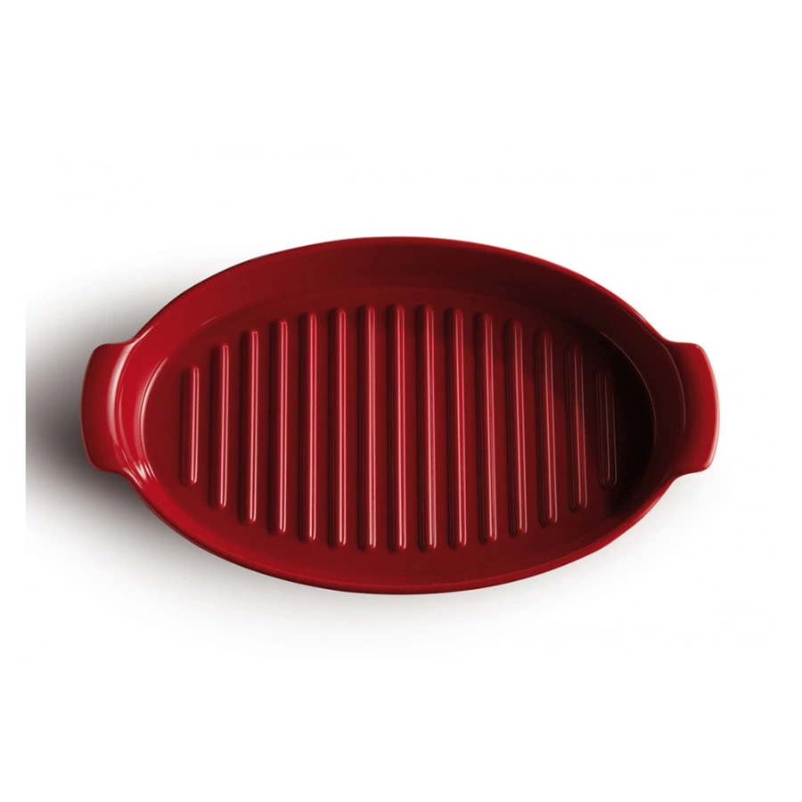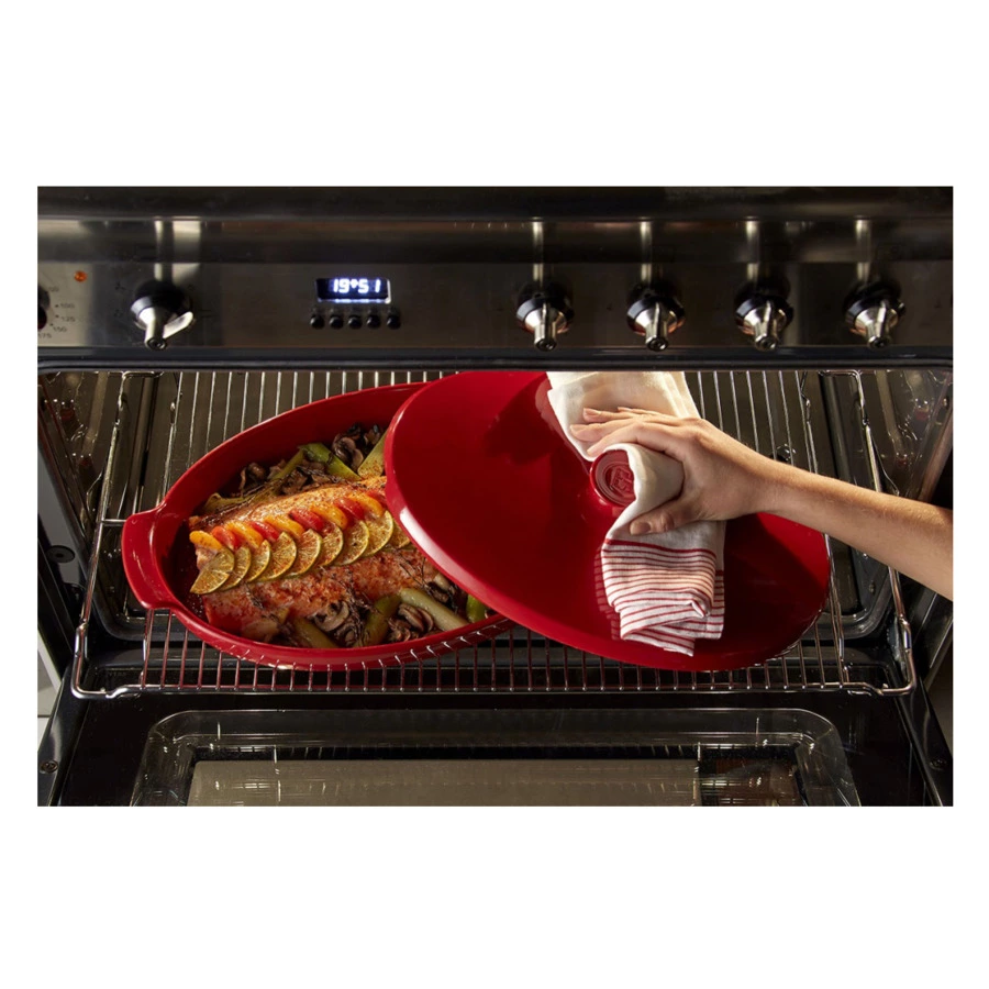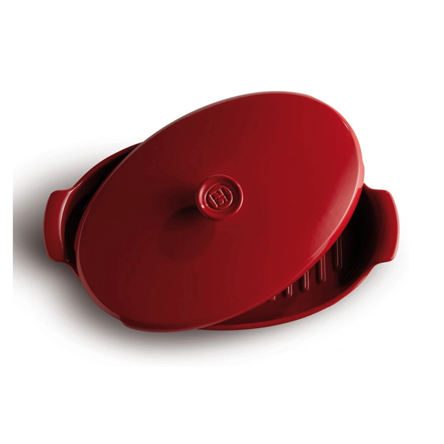 Пар, возникающий при приготовлении в закрытой форме, идеален для запекания такого деликатного продукта, как рыба. Таким способом можно приготовить любую рыбу: целую, филе, стейки, так как не повреждается структура рыбы. Для улучшения вкуса, желательно, использовать свежие травы и специи, которые добавляют различные ароматы. Уксус, лимонный сок, вино, масла (оливковое, арахисовое, кунжутное и т.д.) также прекрасно добавят вкус. Целая рыба или стейки – результат приготовления нежное, идеально приготовленное блюдо без добавления жира. Крышка предотвращает распространение рыбного запаха. Возможно одновременное приготовление гарнира (картофель, лук, овощи). Натуральная, безвредная керамика не меняет вкус блюд. Ребристое основание предотвращает переваривание (рыба располагается над жидкостью). Форму можно использовать для приготовления белого мяса, добавив немного бульона.