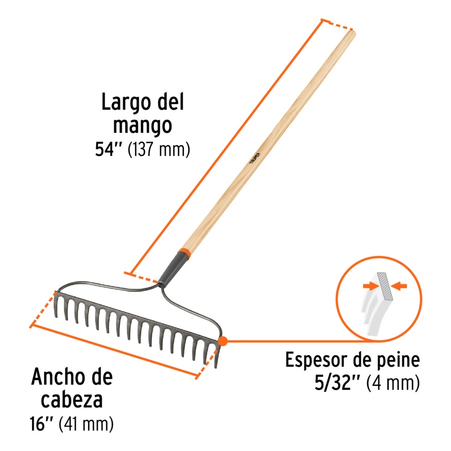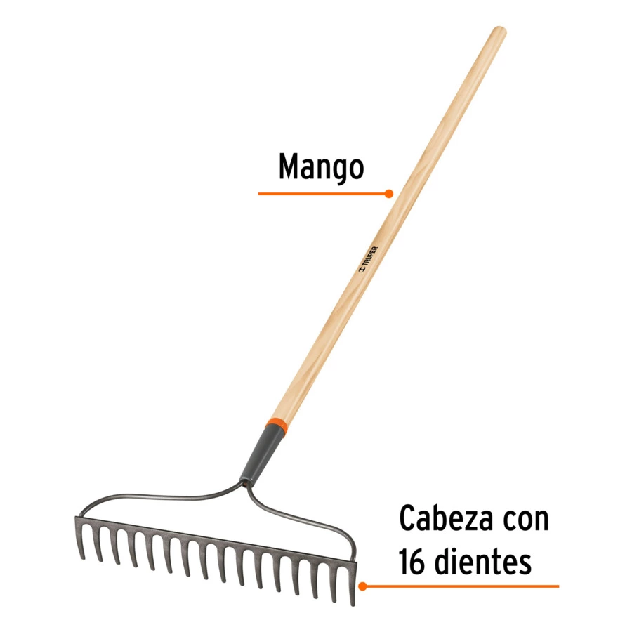 Грабли кованые Truper 16 изогнутых зубьев 41 см, ручка дерево, 152 см, 17882, 00010766227