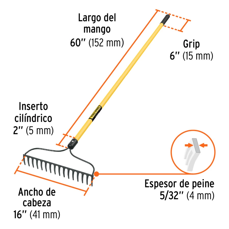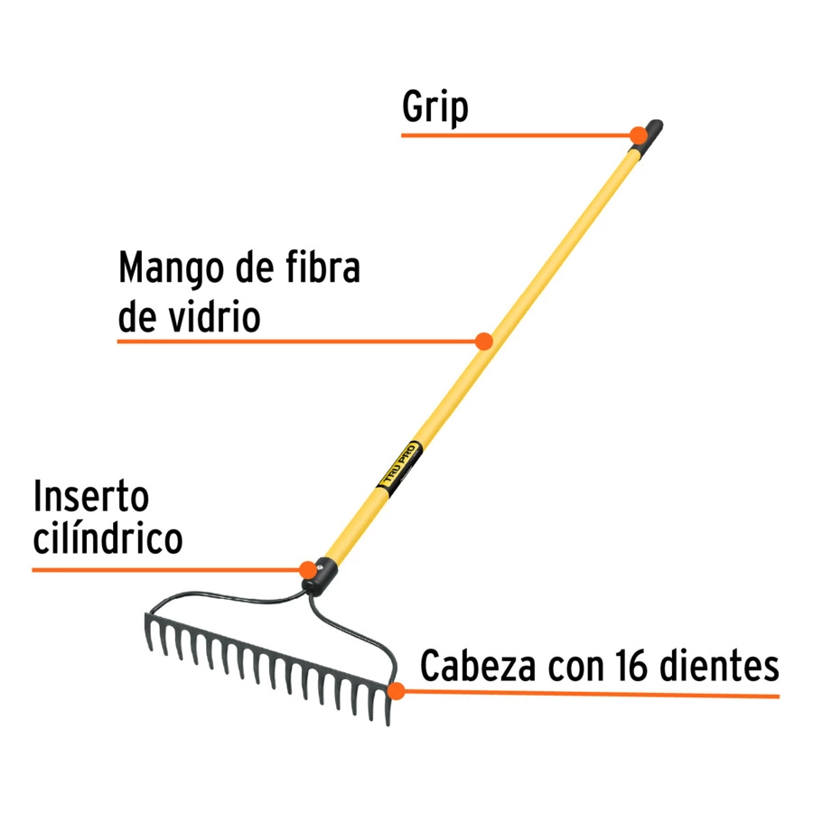 Грабли кованые Truper 16 изогнутых зубьев 41 см, ручка фиберглас, 152 см, 17885, 00010766228