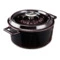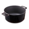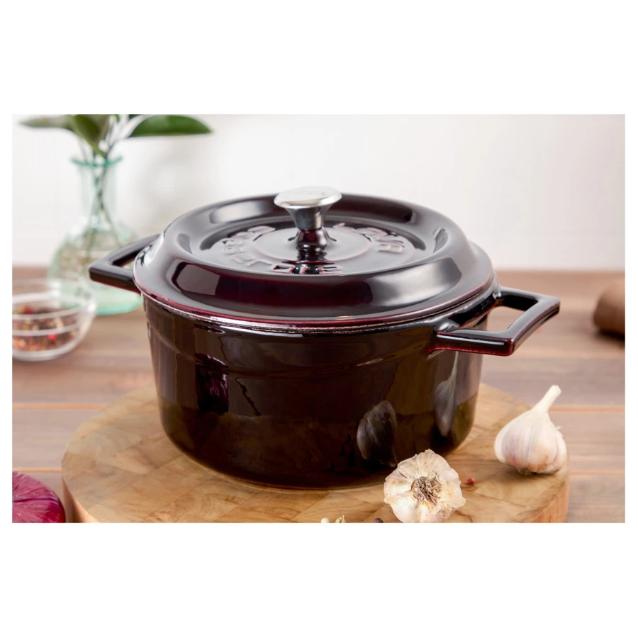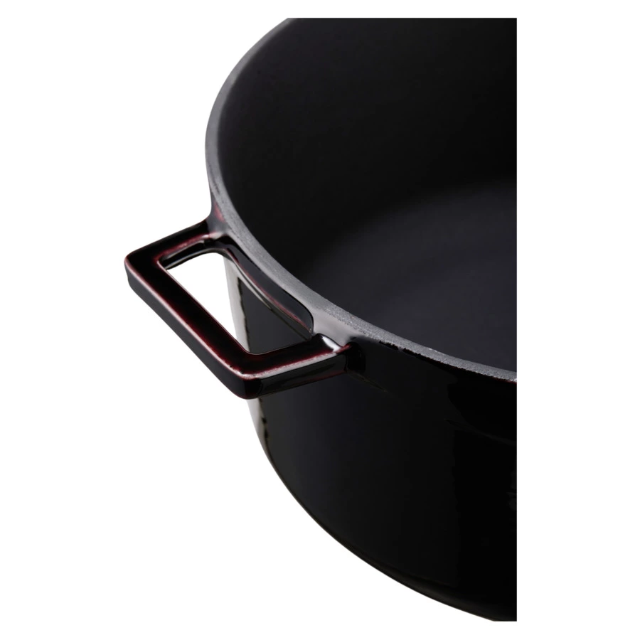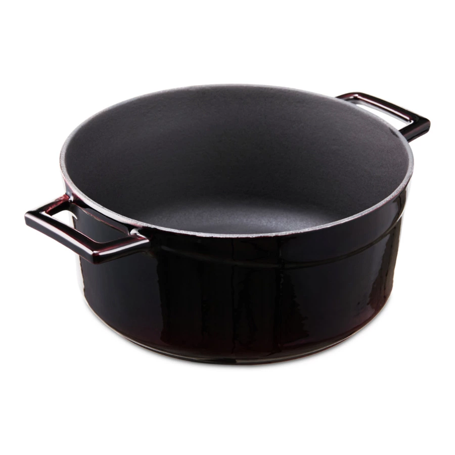 Чугунный корпус с двойным эмалевым покрытием обеспечивает идеальное распределение тепла, а чугунная крышка плотно прилегает и сохраняет влагу. Эргономичные литые ручки гарантируют безопасность, а материал дает возможность использовать кастрюлю не только на домашней плите, но и на открытом огне.