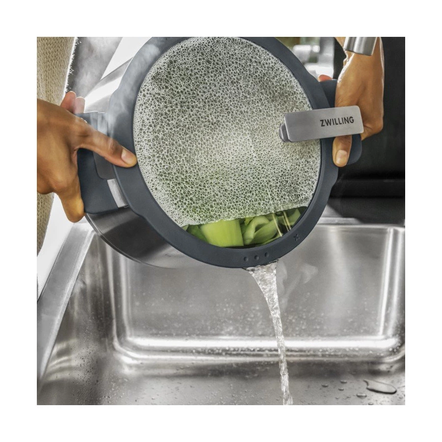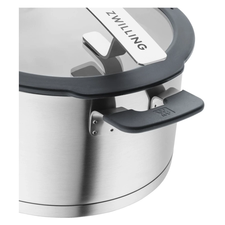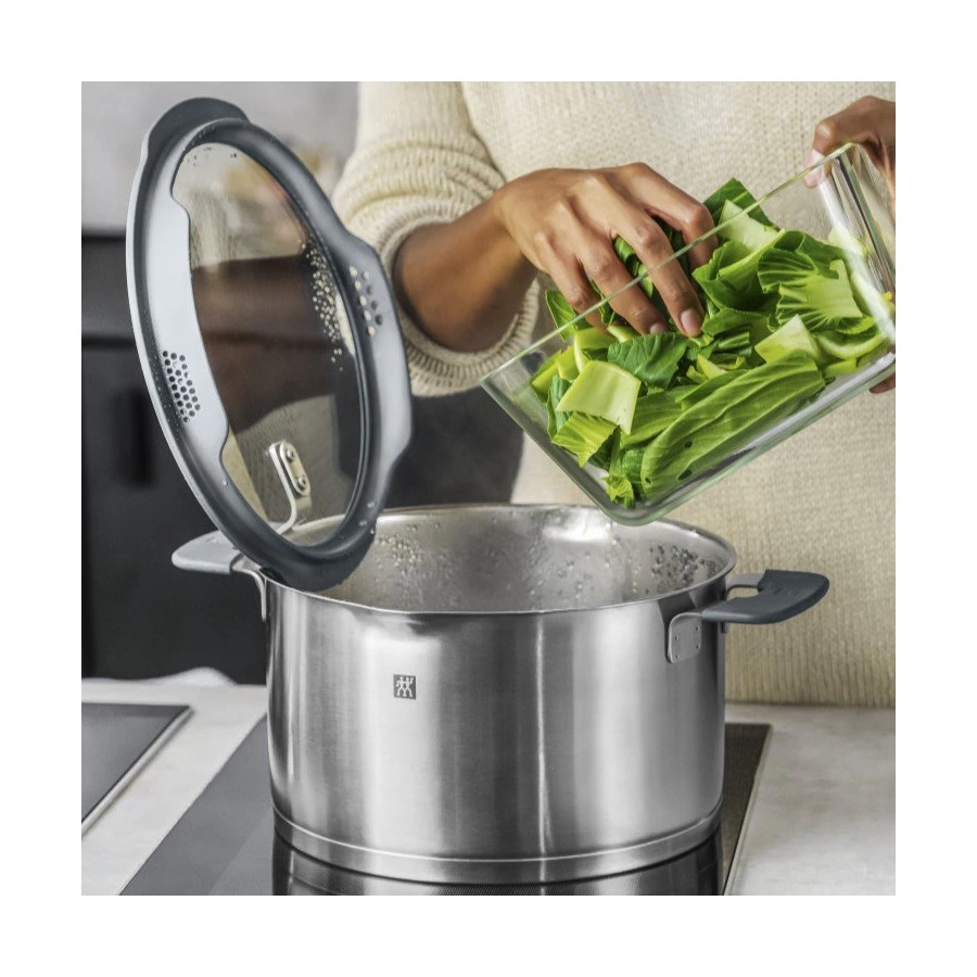 Поднимите кулинарию на новый уровень: большая кастрюля из серии Zwilling Simplify сочетает в себе функциональность и дизайн. Среди нововведений в серии посуды Simplify - широкий набор функций, которые предлагает кастрюля. Изготовлена из матовой нержавеющей стали 18/10, имеет диаметр 24,0 см, вмещает 6,0 литров и дополнена мягкими силиконовыми деталями. И ручки, и стеклянная крышка покрыты серым силиконом. В силиконовую обшивку встроено сито двух разных размеров. Это позволяет легко сливать жидкости, дополнительный дуршлаг не требуется. Метка X на крышке указывает на оптимальное положение крышки для снижения выхода пара при приготовлении пищи. Ещё одно преимущество — дно кастрюли SIGMA Classic+ устроено по принципу сэндвича и обеспечивает оптимальное распределение тепла.