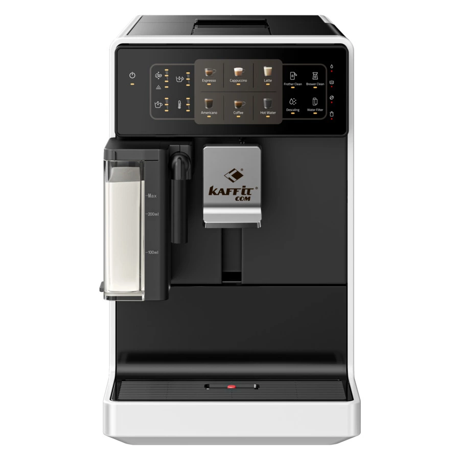 Кофемашина Kaffit A3 отличается компактностью, обтекаемым стильным и лаконичным дизайном. Панель управления с сенсорными иконками для интуитивного использования позволит с лёгкостью найти необходимый напиток или создать собственный рецепт, учитывая личные предпочтения. С кофемашиной Kaffit A3 вы можете приготовить любые напитки из чёрного кофе, кофейные напитки с молоком или горячий чай. Заварное устройство автоматической кофемашины Kaffit A3 с улучшенным контролем давления и идеальной скоростью потока воды позволяет добиться высокого уровня экстракции эспрессо, чашка за чашкой. В кофемашине Kaffit A3 вам доступно для приготовления 6 напитков: Эспрессо, Американо, Кофе, Капучино, Латте, Порция горячей воды. Девять уровней настройки степени помола кофемашины дают возможность подобрать помол для кофейных зёрен любого сорта и обжарки, а коническая кофемолка с точным контролем порошка обеспечит однородное поступление смолотого кофе при каждом помоле для получения наилучшего вкуса вашего напитка. Кофемашина Kaffit A3 быстро генерирует горячую воду и пар, благодаря усовершенствованному термоблоку с общей мощностью нагрева 1400 Вт. Оптимизированная молочная система способна смешивать нужное количество пара, молока и воздуха, создавая нежную молочную пену желаемой температуры. Дизайн молочного контейнера кофемашины Kaffit A3 без лишних трубок упрощает уход и делает его более гигиеничным. Все составные части контейнера являются разборными их можно промывать проточной водой или мыть в посудомоечной машине. Наслаждайтесь свежим кофе от чашки к чашке с технологией coffee residue-free, благодаря дренажному насосу, который гарантирует отсутствие остатков кофе до или после приготовления кофе. Герметичный контейнер защитит кофейные зёрна от внешних воздействий и сохранит их первозданный аромат.