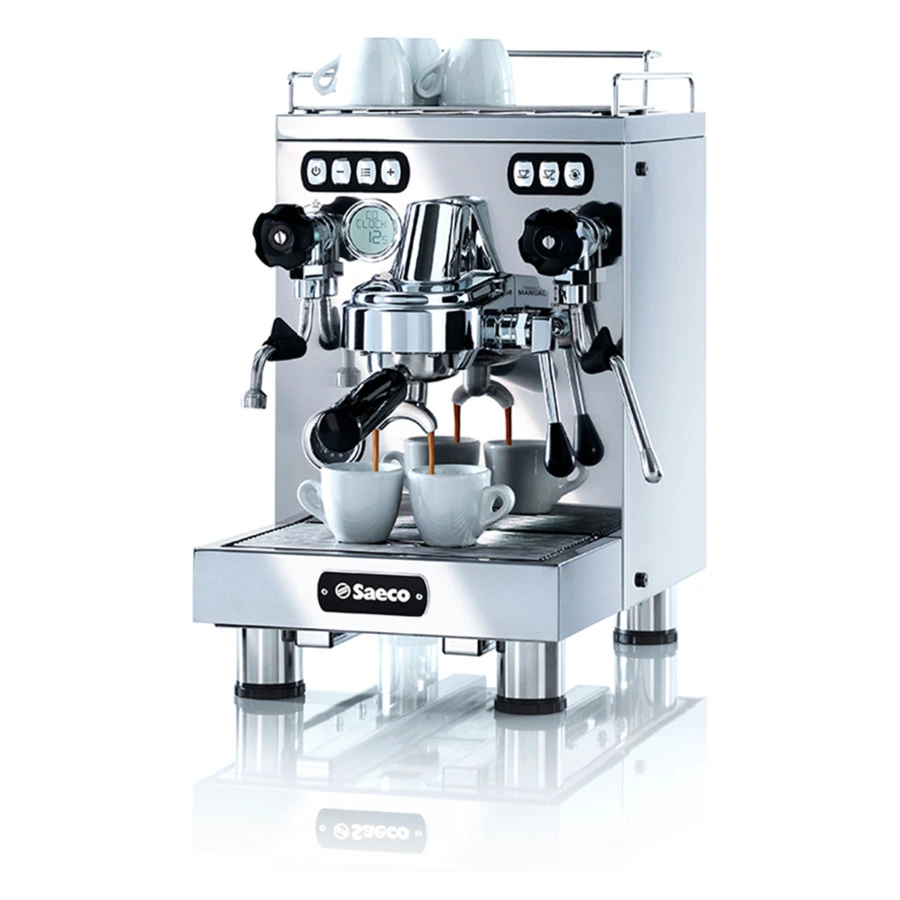 Профессиональная кофемашина SE-50 от Saeco отличается наличием удобного ЖК дисплея с кнопочным управлением; возможностью настройки дозирования; вращающимися устройствами для подачи горячей воды и пара; наличием подогревателя чашек; возможностью работы с различной степенью помола кофе; наличием регулируемых по высоте ножек, что делает эксплуатацию максимально комфортной.