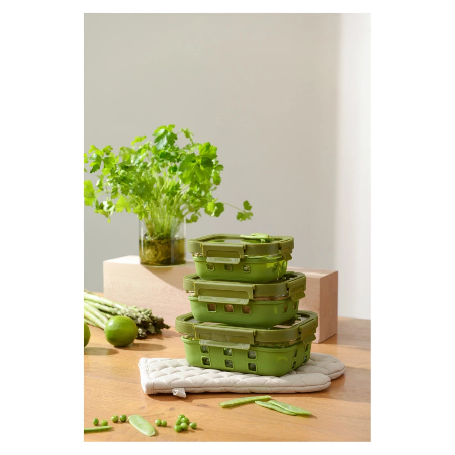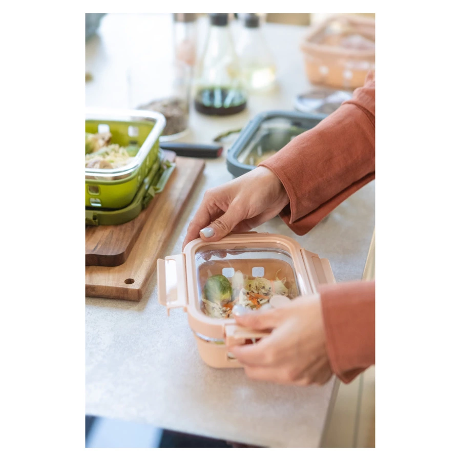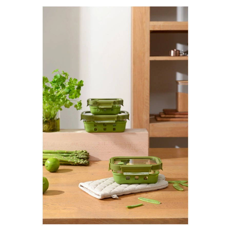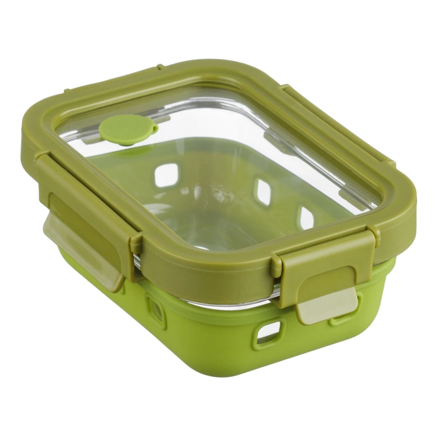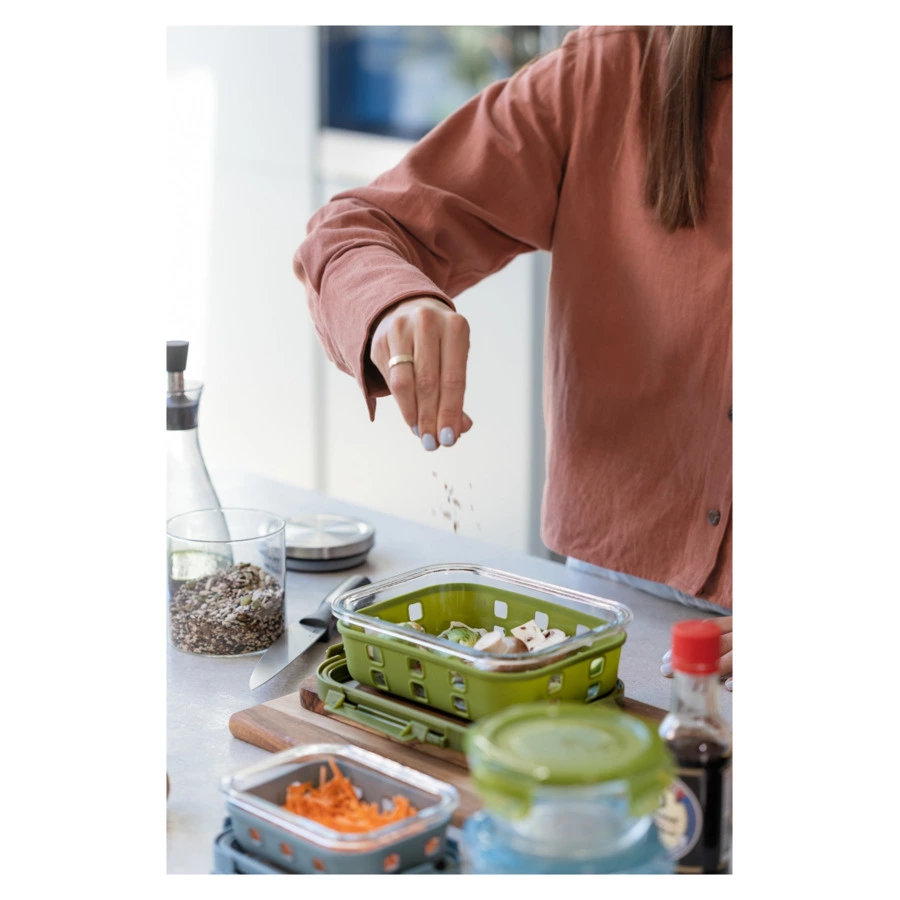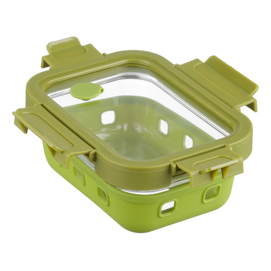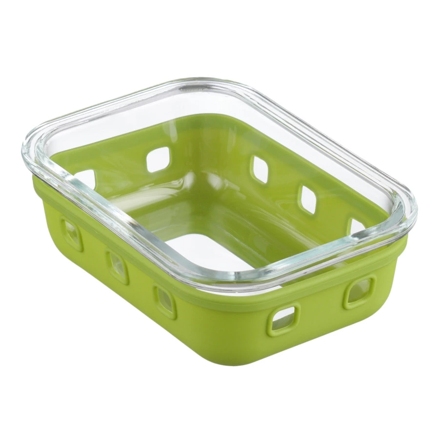 Контейнер стеклянный в чехле из силикона отлично подходит для хранения, запекания и транспортировки продуктов, в том числе готовых блюд. Емкость из боросиликатного стекла не впитывает запахи и загрязнения, легко моется. Крышка с надежными пластиковыми замками на каждой стороне обеспечивает плотное закрывание. Материалы не содержат бисфенол-А и являются абсолютно безопасными для здоровья. Наличие специального вентиляционного отверстия позволяет выпустить лишний воздух или горячий пар, что повышает герметичность и улучшает условия хранения продуктов. Силиконовый чехол предотвращает скольжение, защищает руки от случайных ожогов во время переноски горячих блюд и легко снимается для тщательной очистки контейнера.