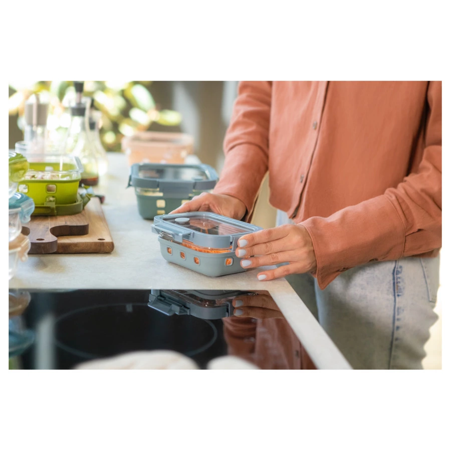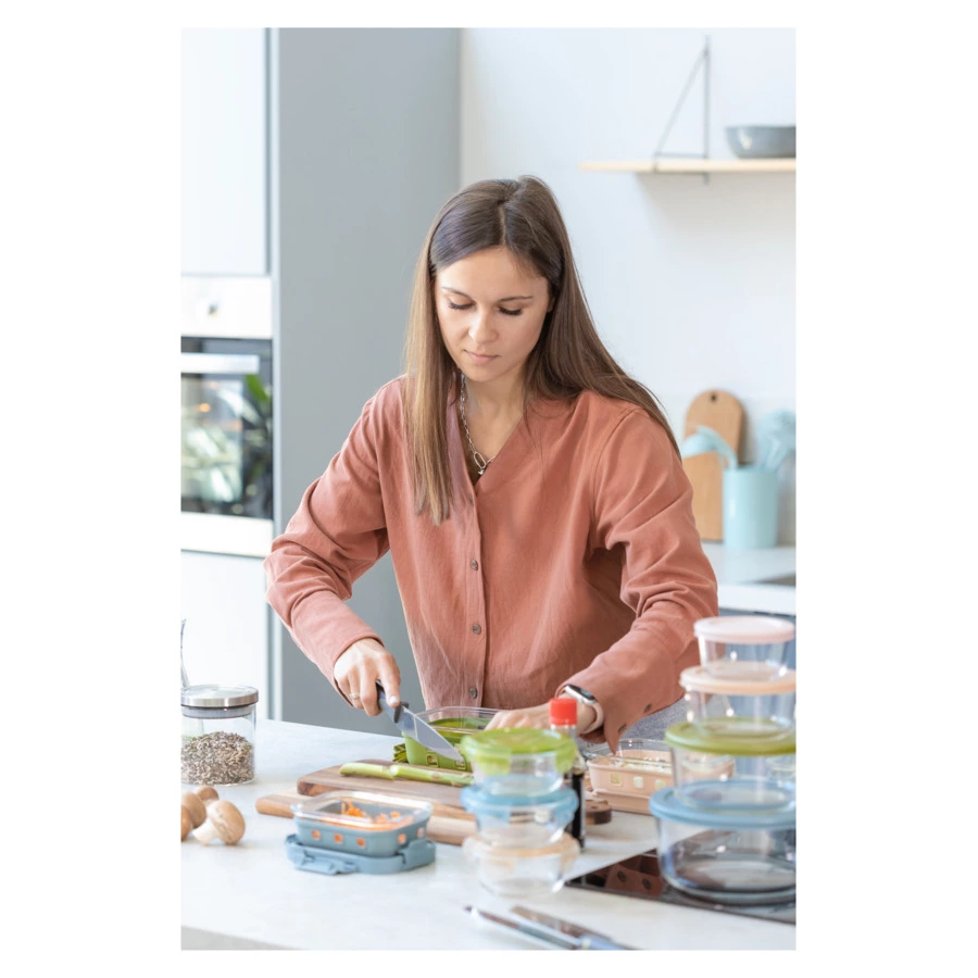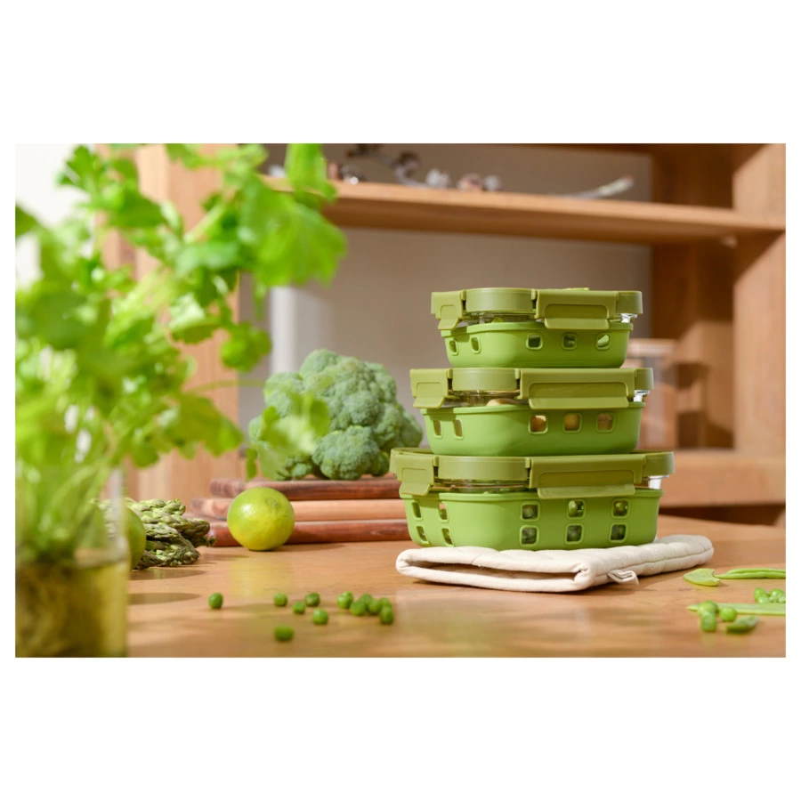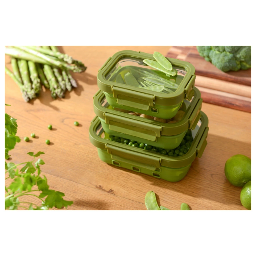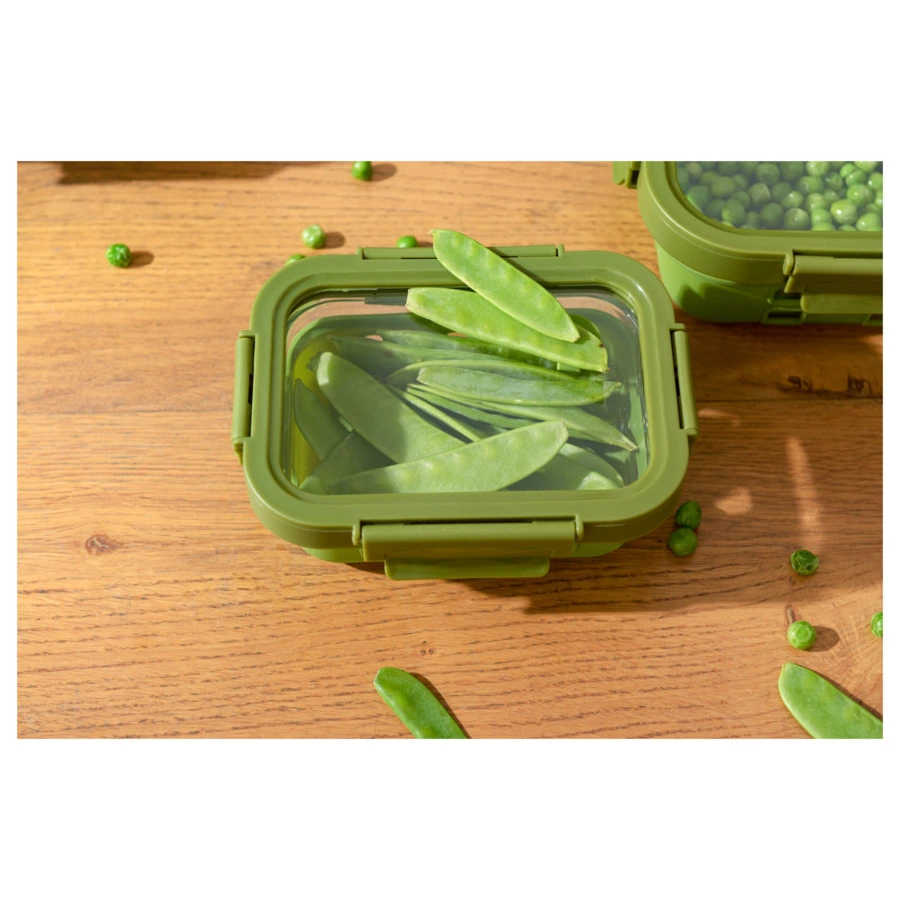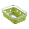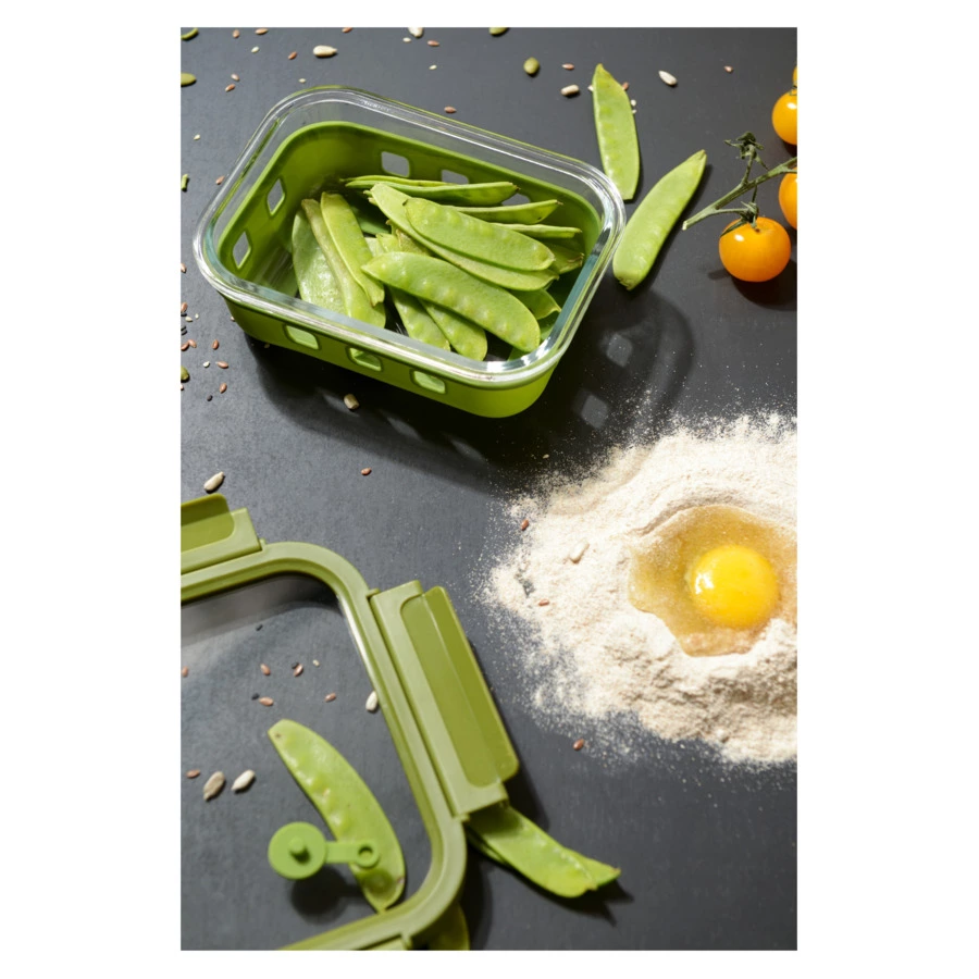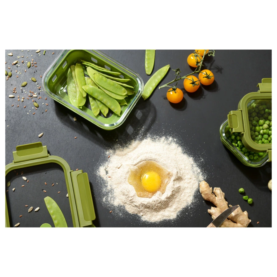 Контейнер стеклянный в чехле из силикона отлично подходит для хранения, запекания и транспортировки продуктов, в том числе готовых блюд. Емкость из боросиликатного стекла не впитывает запахи и загрязнения, легко моется. Крышка с надежными пластиковыми замками на каждой стороне обеспечивает плотное закрывание. Материалы не содержат бисфенол-А и являются абсолютно безопасными для здоровья. Наличие специального вентиляционного отверстия позволяет выпустить лишний воздух или горячий пар, что повышает герметичность и улучшает условия хранения продуктов. Силиконовый чехол предотвращает скольжение, защищает руки от случайных ожогов во время переноски горячих блюд и легко снимается для тщательной очистки контейнера.