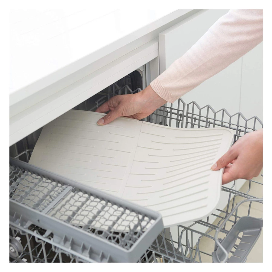Коврик изготовлен из мягкого нескользящего силикона — подходит для сушки тарелок, кружек и бокалов. Вода с посуды стекает из поддона непосредственно в мойку — всегда сухая столешница. Изготовлен из долговечного силикона — легко моется, можно мыть в посудомоечной машине. Идеальное решение для сушки небольшого количества посуды. Удобно хранить, например, в ящике стола — легко складывается. Гарантия 2 года.