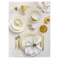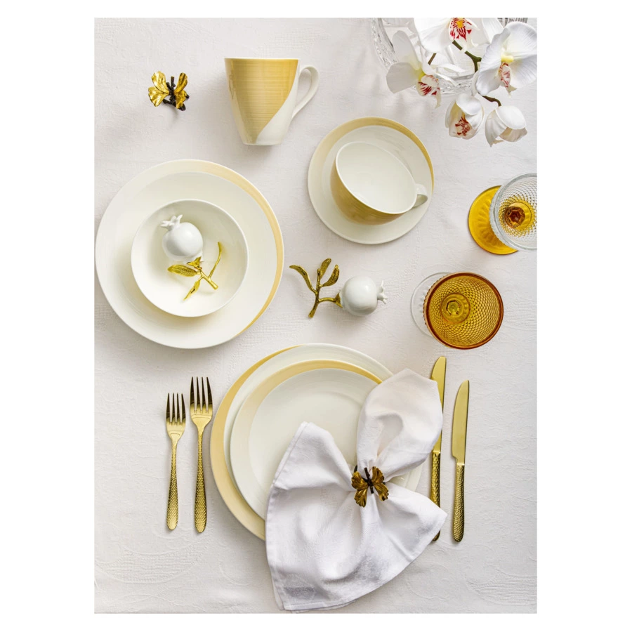 Коллекция «Золотой жемчуг» от японского бренда Narumi – пример гармоничного союза современных минималистичных форм и выразительной отделки. Интересная фактурная поверхность предметов деликатно дополнена градиентным золотым декором, который привлекает внимание, но в то же время не утяжеляет внешний вид изделий. Ассиметричные силуэты блюд и тарелок создают на столе оригинальный визуальный эффект. Комплект посуды из этой серии станет стильным украшением праздничной сервировки.