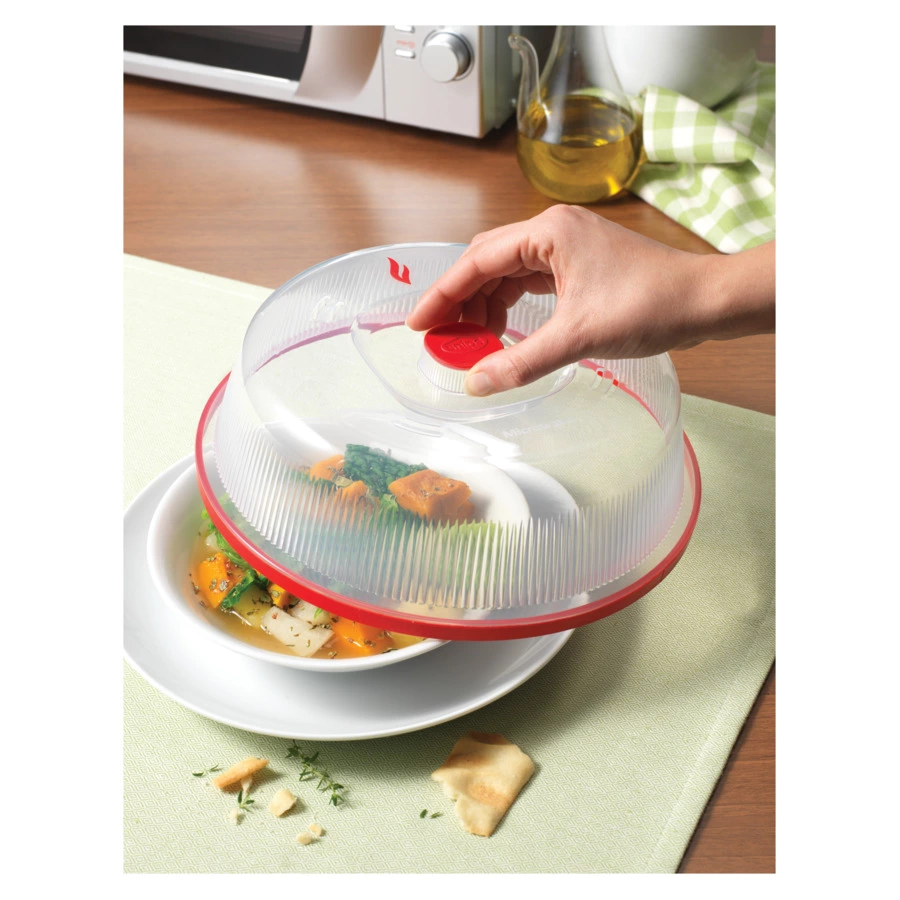 Крышка предназначена для использования в микроволновой печи. Она предотвращает разбрызгивание пищи и появление конденсата на стенках камеры, значительно облегчая очистку устройства после приготовления. При её использовании блюда сохраняют свой естественный вкус и неизменный химический состав. Также можно использовать для сохранения температуры блюда во время сервировки. Можно мыть в посудомоечной машине, значительно сокращая затраты времени и усилий.