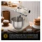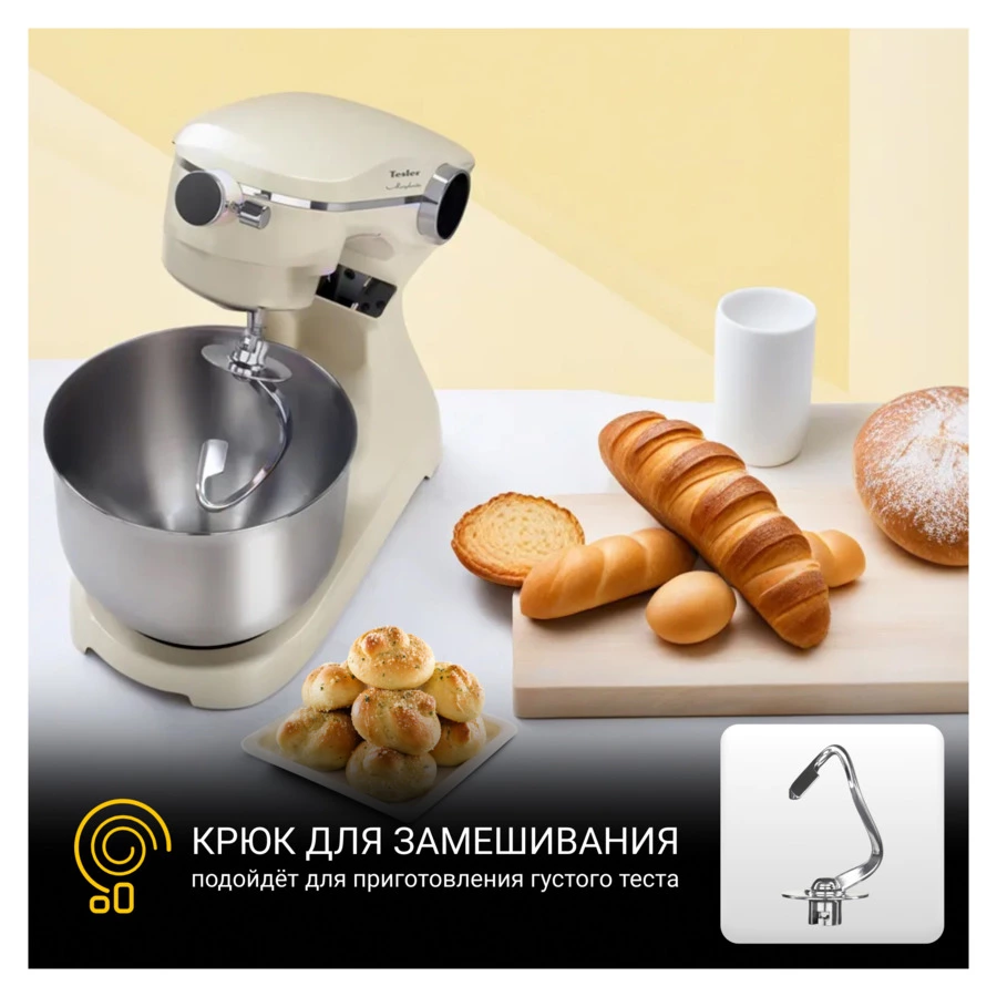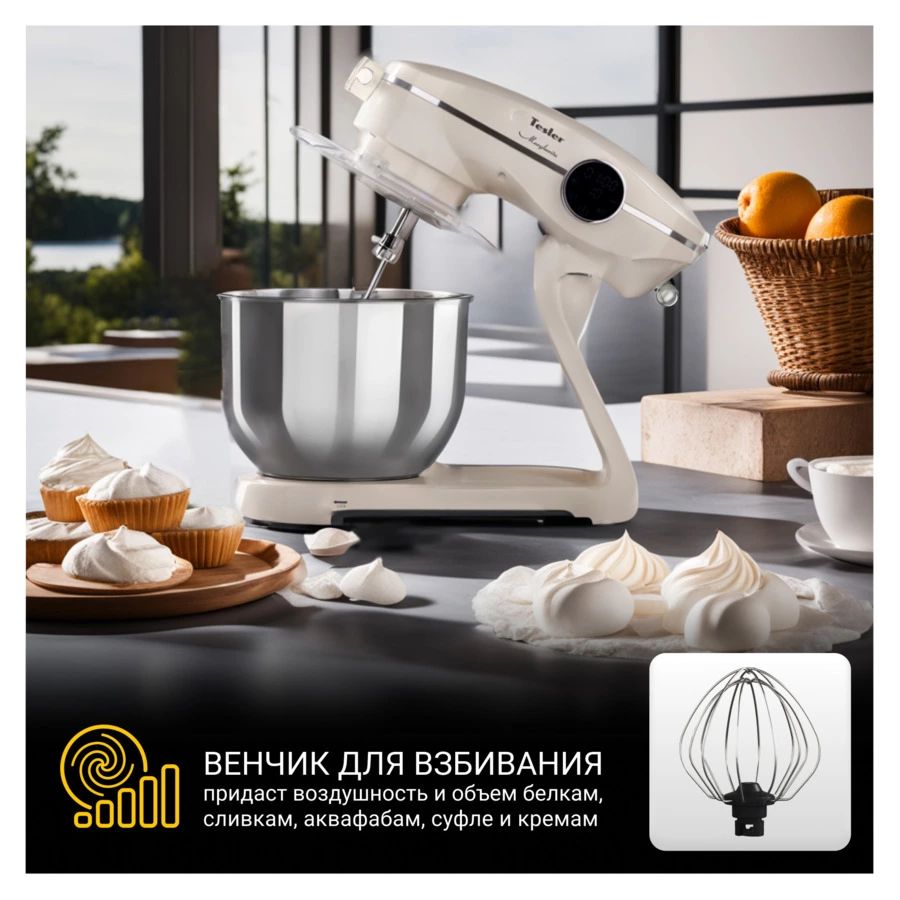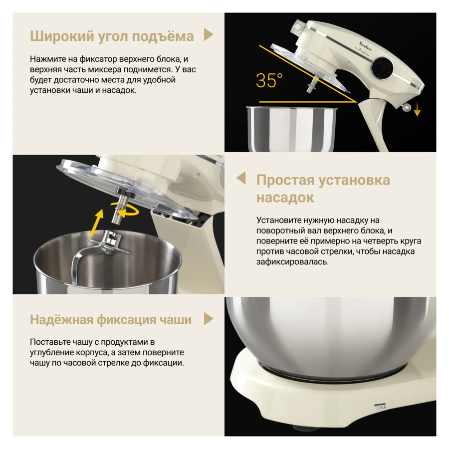 С помощью идущих комплекте аксессуаров вы сможете быстро и эффективно соединять различные ингредиенты. Крюк для замешивания предназначен для приготовления густого теста для пирогов, хлеба и другой выпечки. Насадка для перемешивания подойдёт для смесей средней вязкости, таких как овощные пюре и соусы. Венчик будет полезен для взбивания яиц, сливок, кремов, чтобы придать им воздушность и объем. Конструкция планетарного миксера позволяет взбить венчиком даже 1 яйцо, чтобы приготовить небольшую порцию. Все насадки изготовлены из прочной нержавеющей стали.