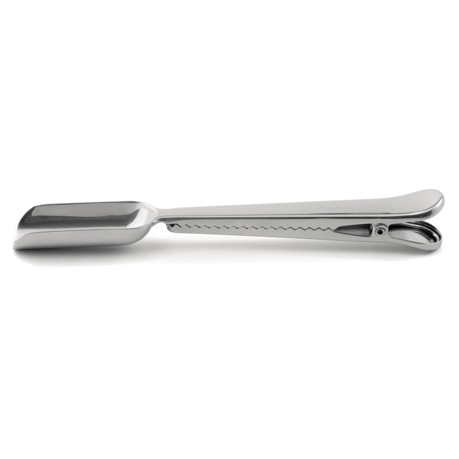 Устройство является одновременно удобным зажимом для пакетиков и ложкой для сеций. Можно мыть в посудомоечной машине.