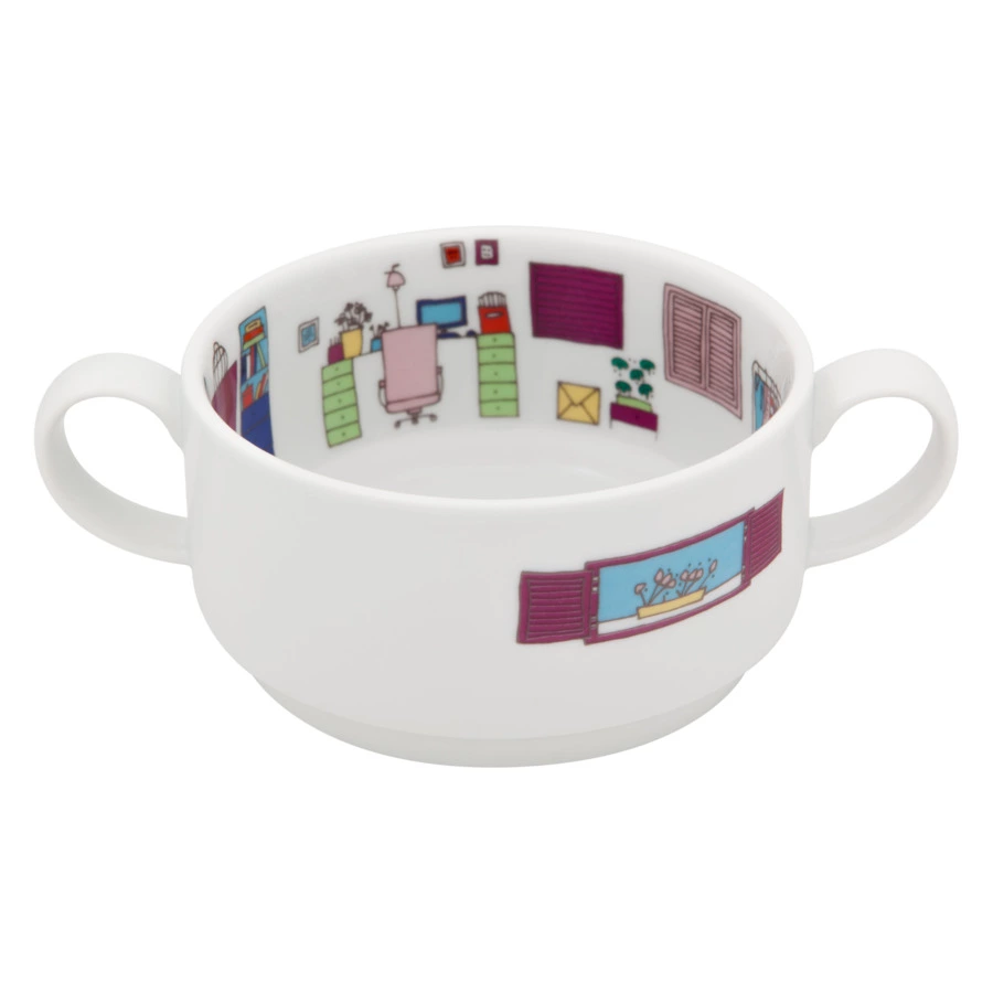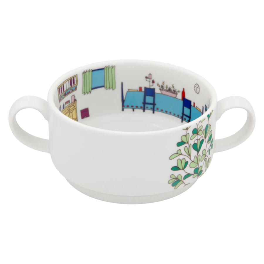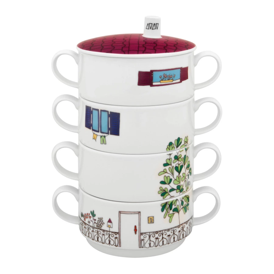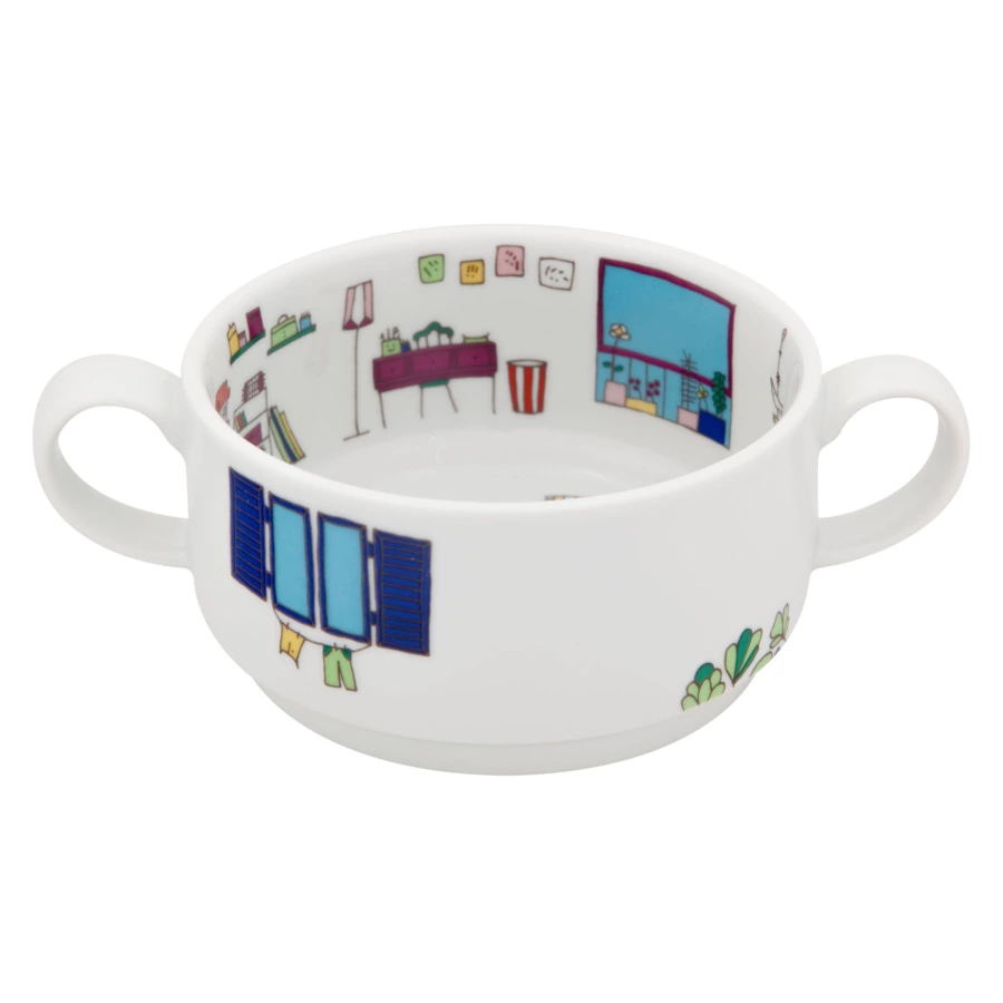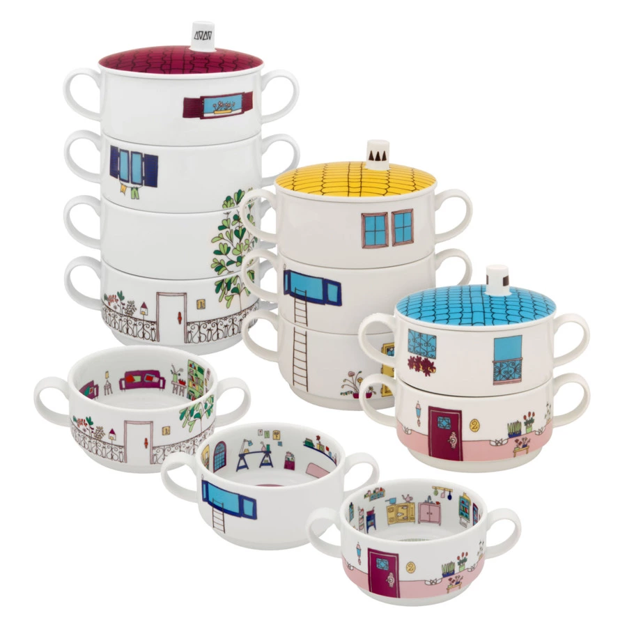 Оригинальный комплект из четырёх бульонниц входит в коллекцию «Цветочный квартал». Детская серия посуды была разработана бразильской художницей Фернандой Массотти специально для Vista Alegre. Изделия декорированы милыми иллюстрациями снаружи и внутри. На каждом предмете можно увидеть экстерьер дома и интерьер комнаты с чёткой прорисовкой деталей и красочным оформлением.