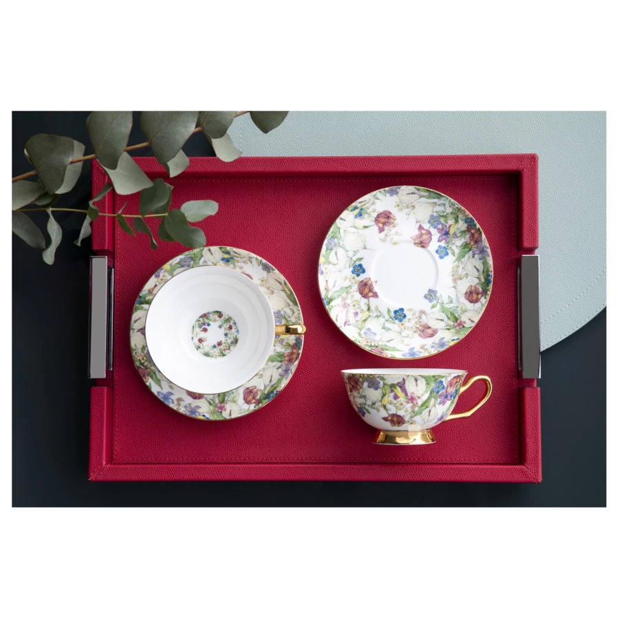 Набор чайных пар «Флёр д'Ор» от бренда Decor de table станет одним из главных акцентов сервировки благодаря своему элегантному дизайну. Изящный цветочный рисунок переливается сочными оттенками синего, красного, бордового и изумрудно-зеленого. Золотая кайма блюдца повторяется на кромке чашки. Роскошь комплекта подчеркнута позолоченной отделкой основания и ручки-петельки. Предметы изготовлены из костяного фарфора – материала, известного не только своей экологичностью, но и удивительной прочностью. Золотой декор нанесен вручную.