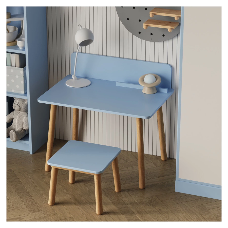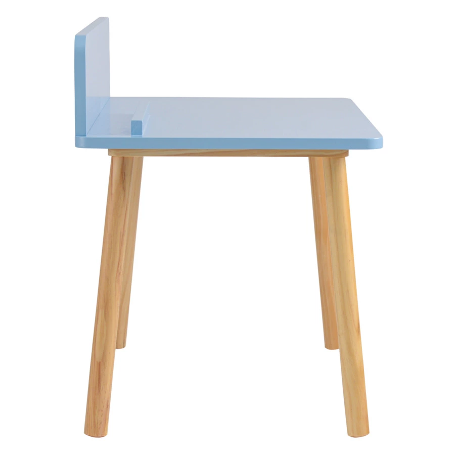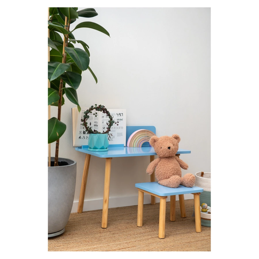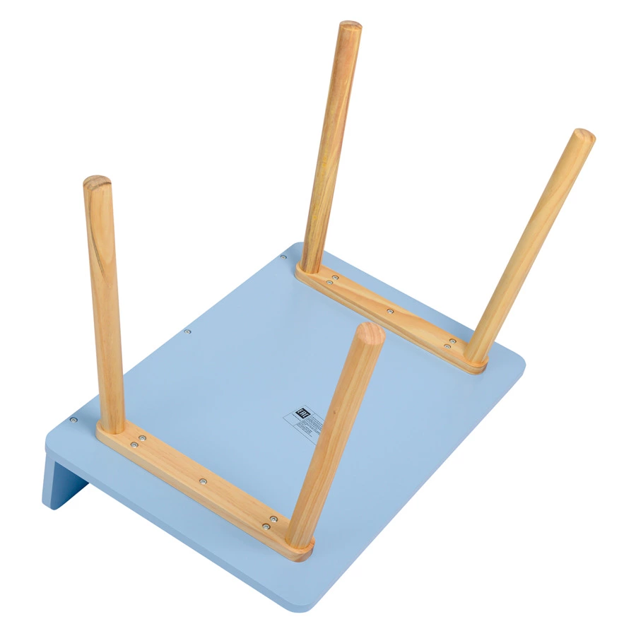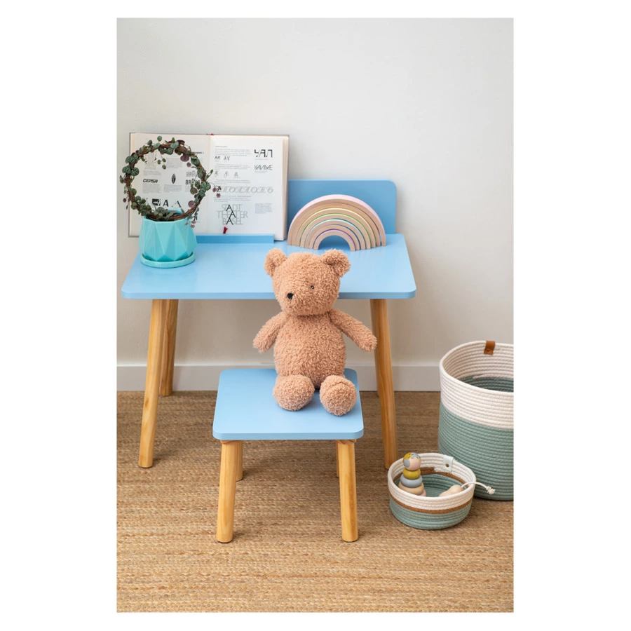 Материалы: древесина сосны, МДФ. Размеры: стол – 75х50х67 см, стул – 35х35х29 см. Высота столешницы: 50 см. Цвет: голубой.