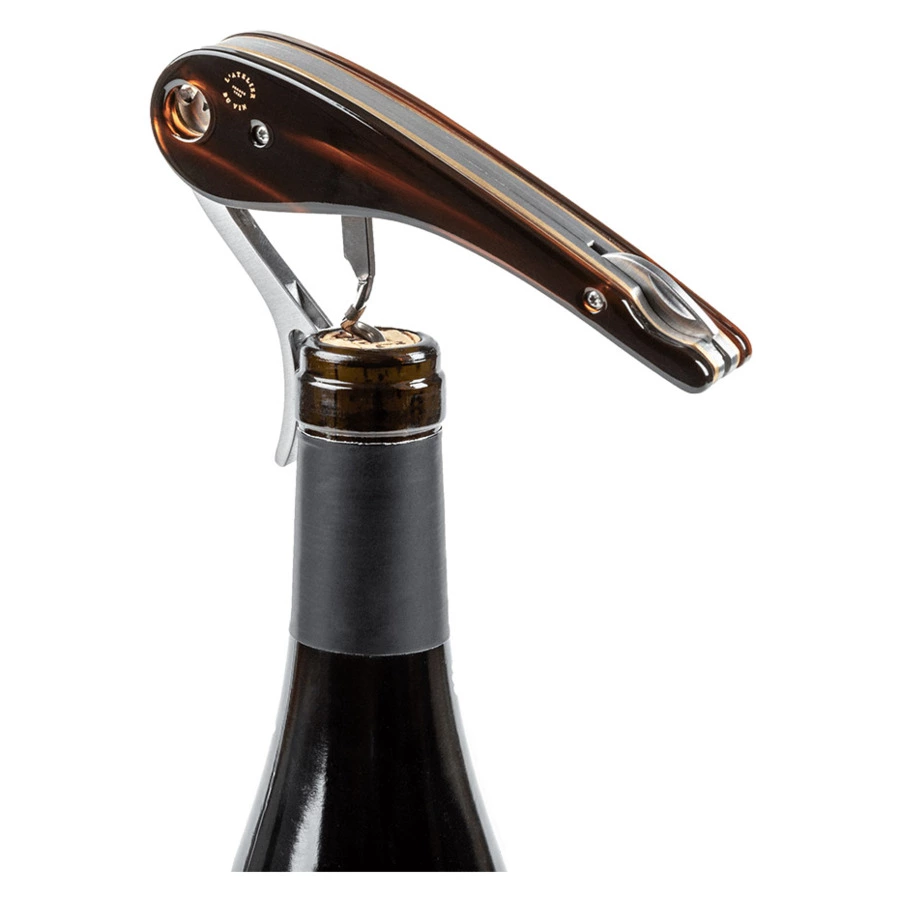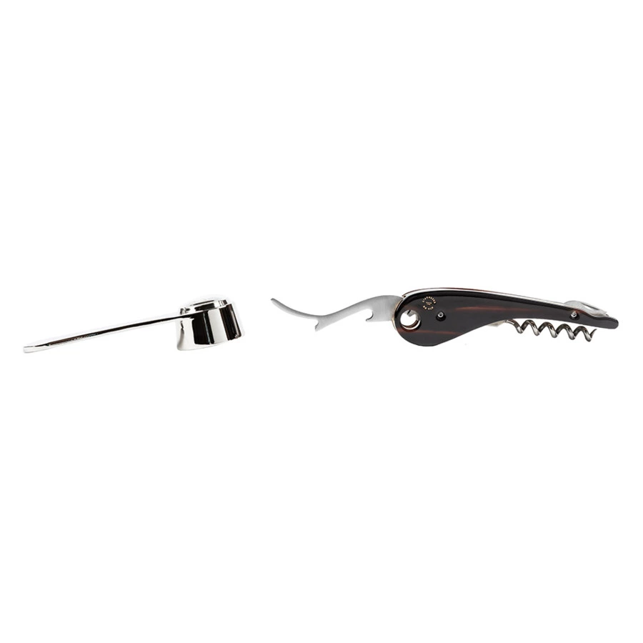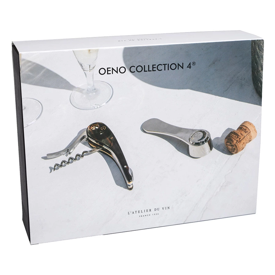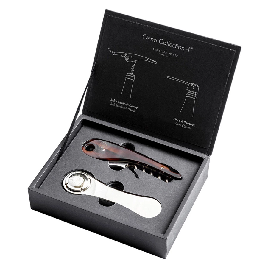 Oeno Collection 4 - это кивок в сторону любителей вина и изысканных вещей. Она наполняет глаза коллекционеров удивлением. Эта высококачественная черная матовая коллекционная коробка сомелье в миниатюрном формате включает 2 уникальных и подлинных энологических аксессуара. 2 фирменных винных инструмента L'Atelier du Vin, созданных с мастерством. 2 аксессуара сомелье, предназначенные исключительно для искусства открывания бутылок изысканного вина и шампанского. Сверху находится штопор сомелье Soft Machine Dandy. Специальное издание из нержавеющей стали, латуни и ацетата, с коричневыми бликами, играющими на свету, и красивыми золотыми буквами L'Atelier du Vin, нанесенными горячим тиснением. Какая элегантность! Его изгиб образует запятую, как бы отмечая перерыв в дегустации вина. Он собран и отделан вручную, в комплект входят нож для разрезания фольги и открывашка для бутылок. Как только рычаг помещается на горлышко, система шестеренок гениально закручивается, чтобы плавно извлечь пробку одним легким движением. Уникальная система и запатентованный дизайн L'Atelier du Vin. Внизу - хромированная открывалка для пробок шампанского с оригинальным механизмом открывания. Просто расположите губки вокруг пробки и поверните ручку, слегка надавливая большим или указательным пальцем. Пробка освобождается с обескураживающей легкостью, не соскакивая, и остается внутри открывалки. Эта энологическая диковинка - самый безопасный и практичный способ открыть бутылку шампанского, не потеряв ни капли.