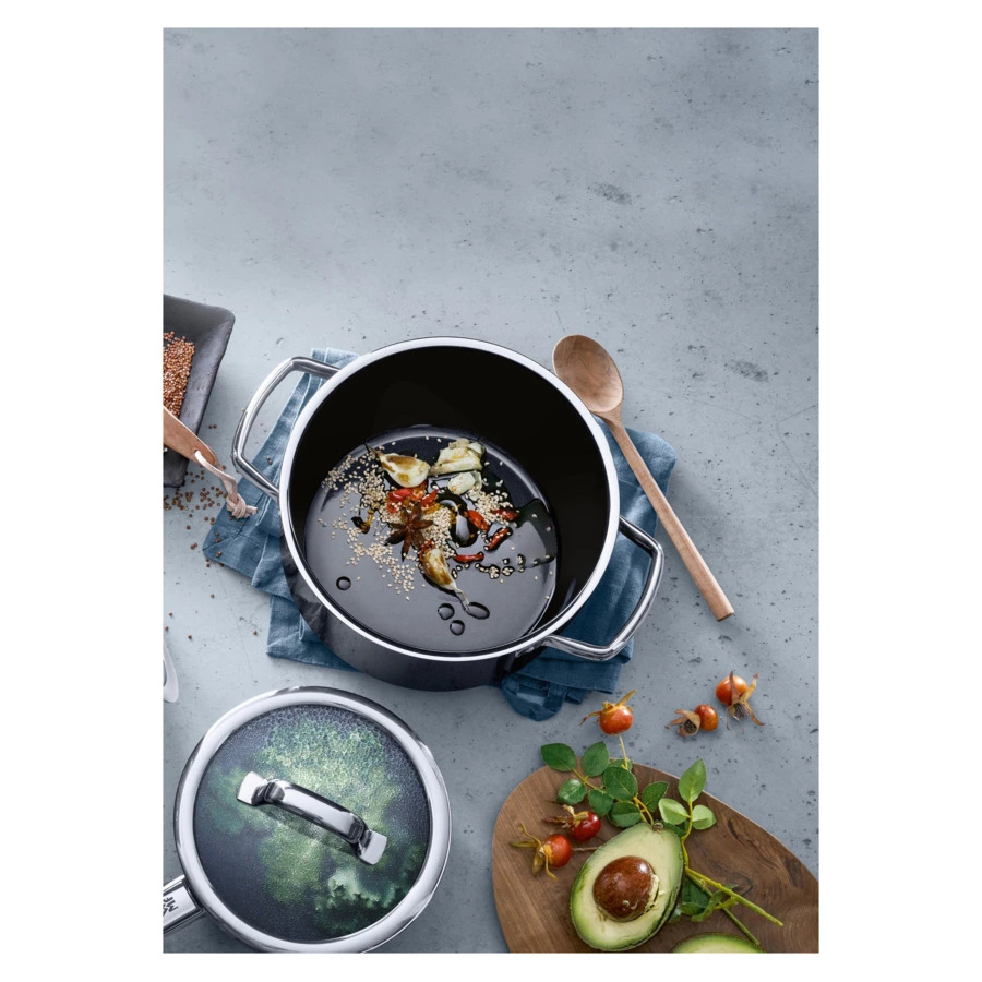 Такое сочетание высококачественных материалов и технологии производства позволяет гарантировать первоклассные эксплуатационные свойства посуды Fusiontec.Гладкая внутренняя поверхность устойчива к царапинам и следам износа, позволяет готовить блюда с небольшим количеством масла и легко моется.