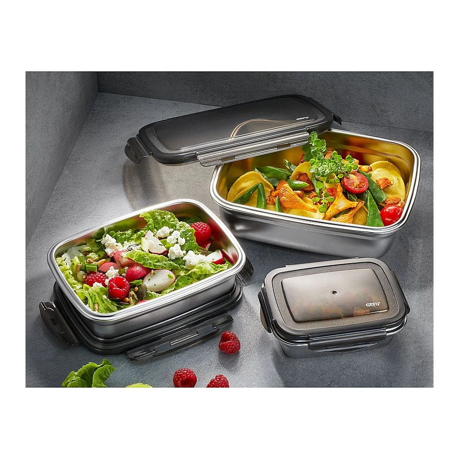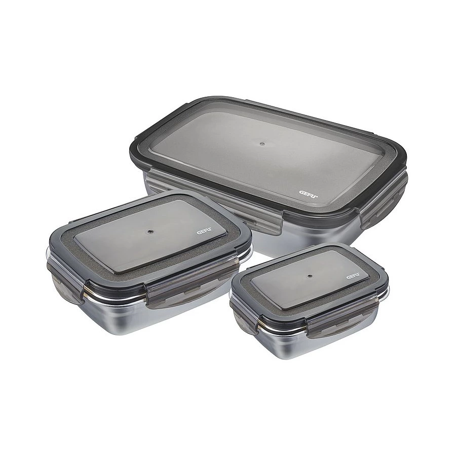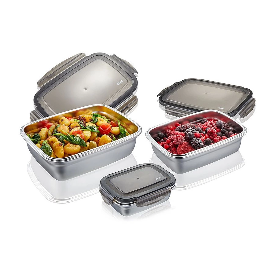 Универсальный набор контейнеров ПРЕППО - необходимый элемент трапезы современного человека! Емкость из высококачественной нержавеющей стали и герметичная пластиковая крышка защелкивающаяся по четырем сторонам представлена в трех объемах - 400, 1000 и 1800 мл. Прочный контейнер на 100% герметичен, универсален и сохраняет продукты свежими в течение длительного времени. Помимо хранения контейнеры ПРЕППО можно использовать для заморозки, разогрева или запекания продуктов.