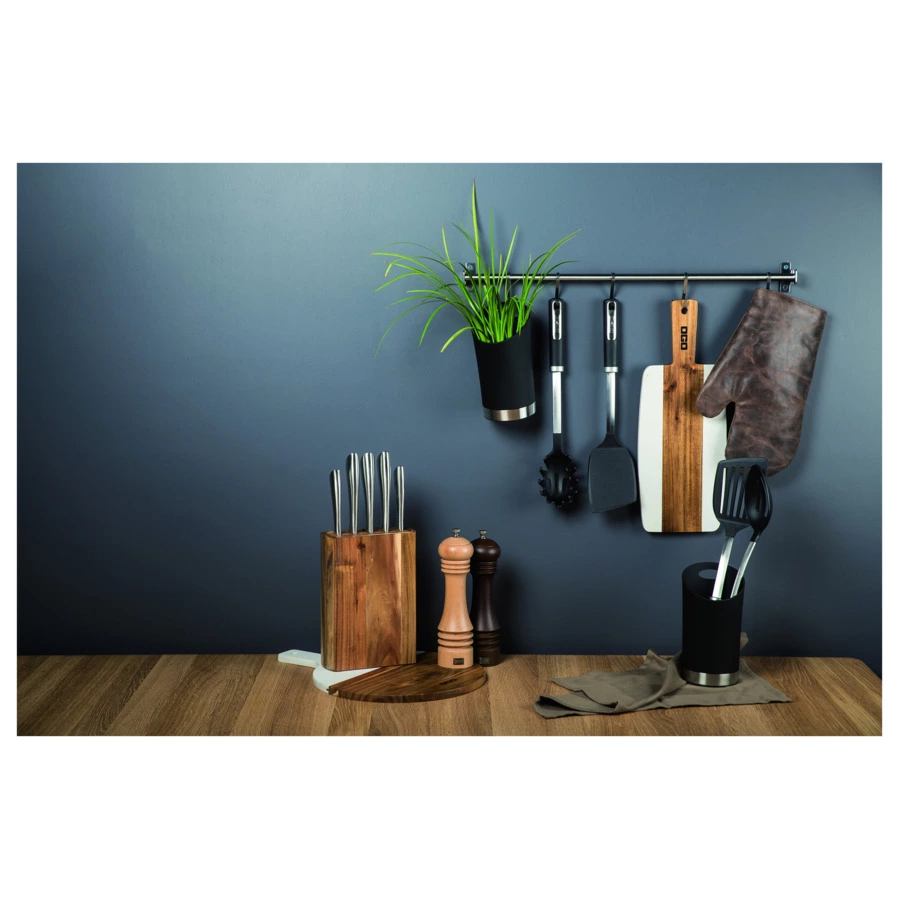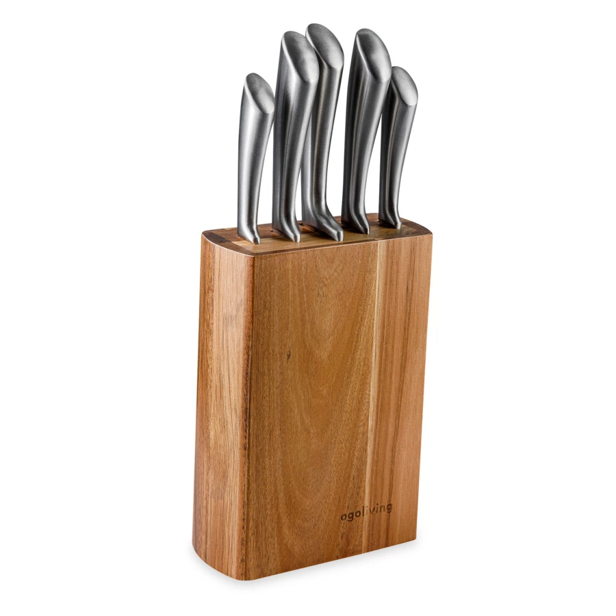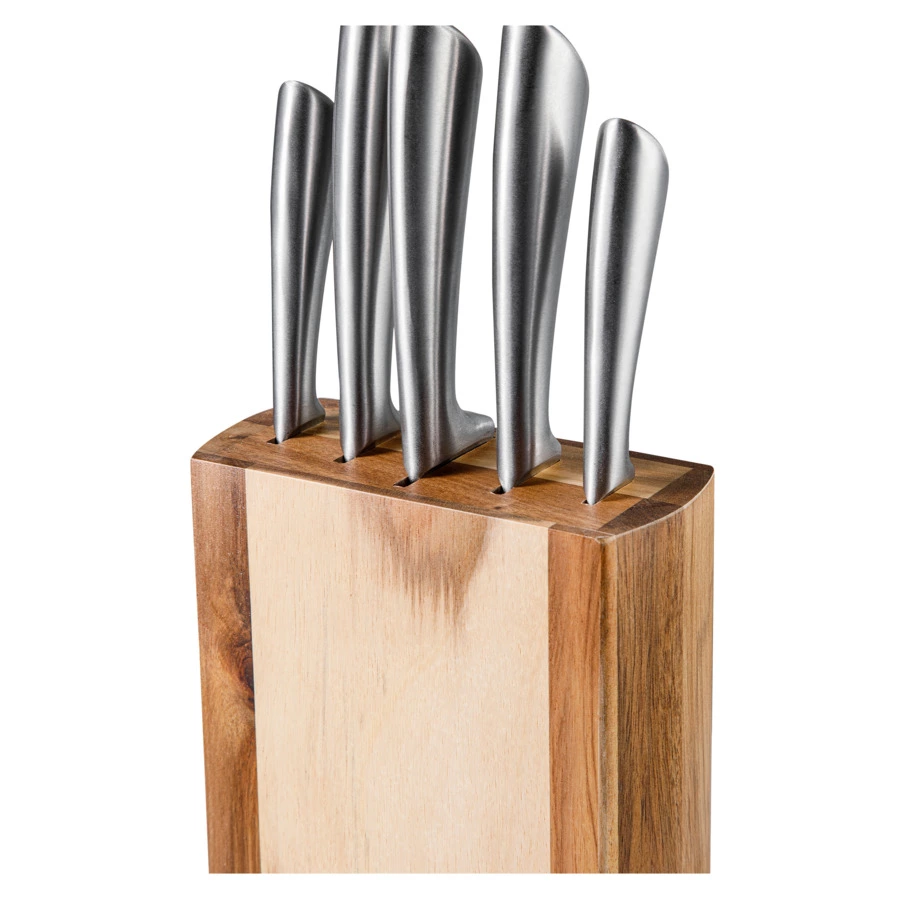 Подставка для ножей из дерева акации привнесёт на вашу кухню деревенский стиль. Блок продаётся с 5 ножами из нержавеющей стали (толщина лезвия 1,5 мм). Эта практичная вещь украсит ваш дом и сэкономит пространство на вашей кухне!