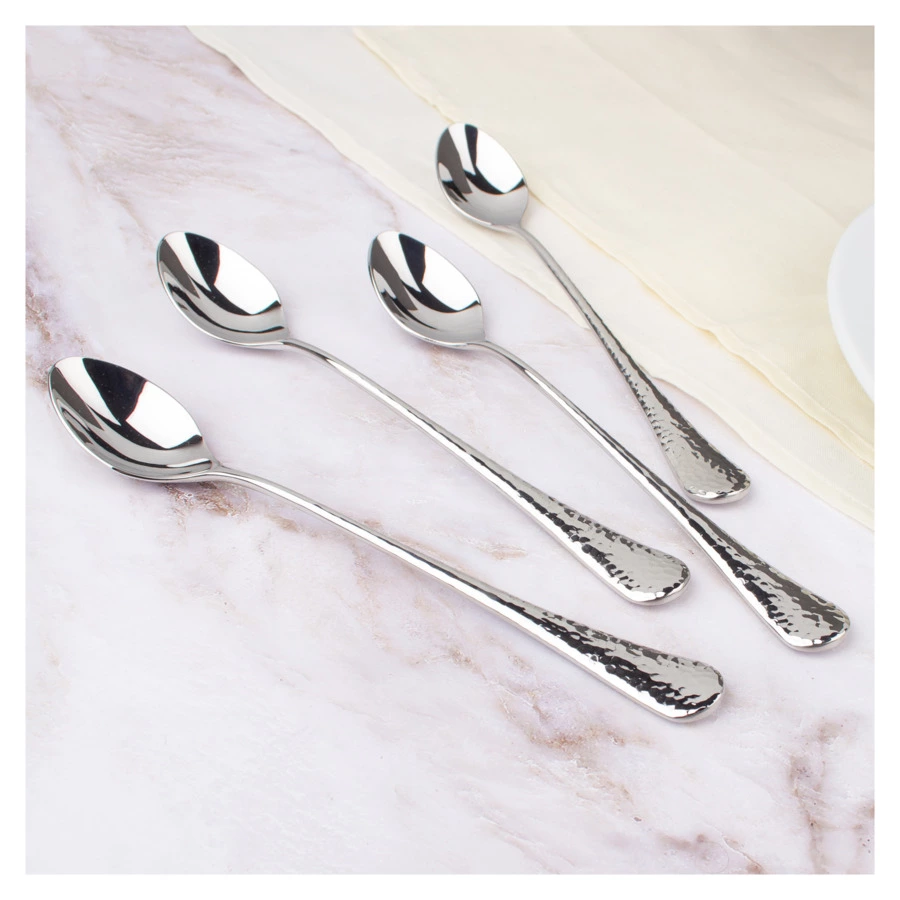 В набор входят 4 ложки длиной 20.1 см для латте. Материал - нержавеющая сталь с зеркальной полировкой. Толщина изделий составляет комфортные 3,5 мм. Они удобно лежат в руке, благодаря продуманной балансировке. Необычная текстура поверхности в сочетании с металлическим блеском придают этим стильным изделиям неповторимый шарм.