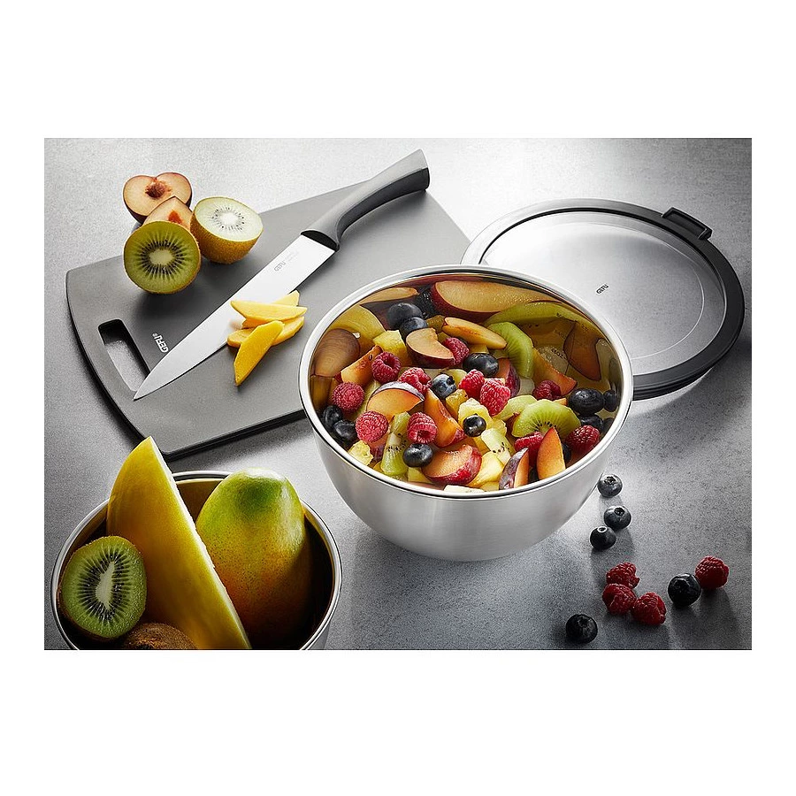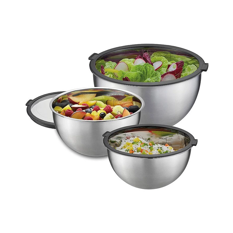 Набор, состоящий из трех чаш из нержавеющей стали разных размеров, очень универсален. Герметичные крышки из прозрачного высококачественного пластика не только позволяют хорошо видеть содержимое, но и обеспечивают свежесть продуктов.