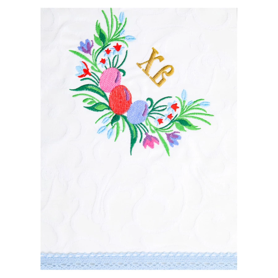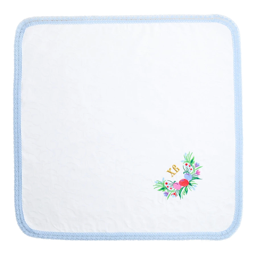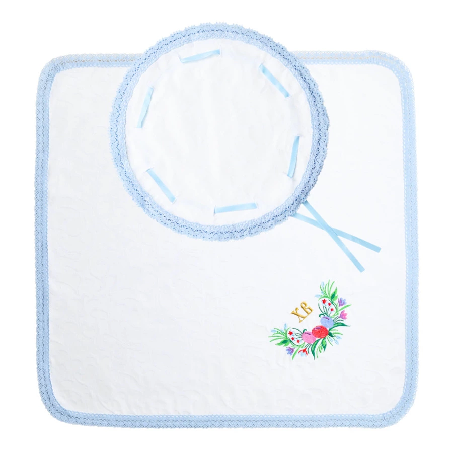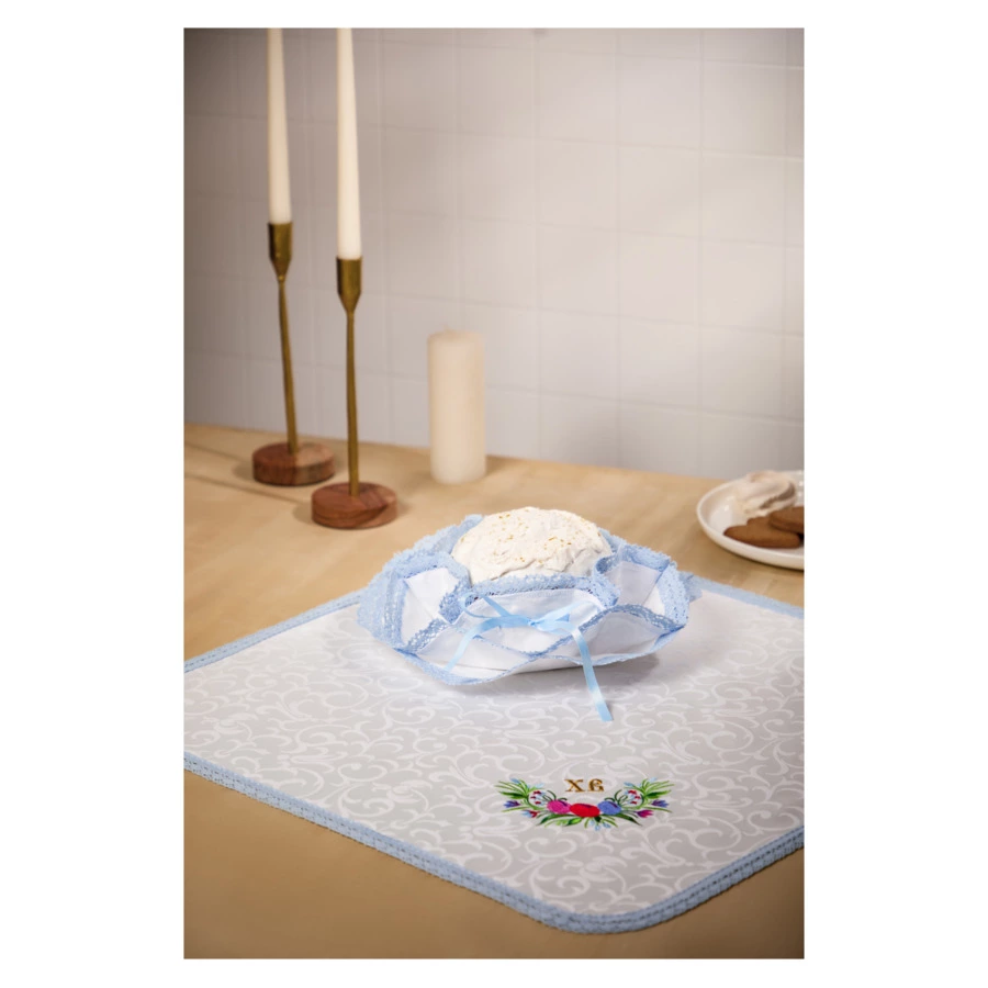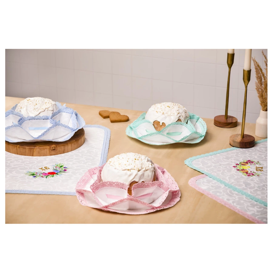 Пасхальный набор от WILLIAMS OLIVER станет прекрасным дополнением сервировки праздничного стола. Изделия сшиты из прочного жаккардового полотна с затейливым тканым узором, по краю обработаны плетеной кружевной тесьмой голубого, зеленого или розового оттенка. Квадратная салфетка украшена искусной яркой вышивкой с традиционной символикой. Круглая трехслойная куличница имеет оригинальную конструкцию. В некоторых местах по окружности слои скреплены между собой, а в верхний продета ленточка. Если ее стянуть, края приподнимутся, образуя своего рода корзинку для кулича с кармашками для крашеных яиц.