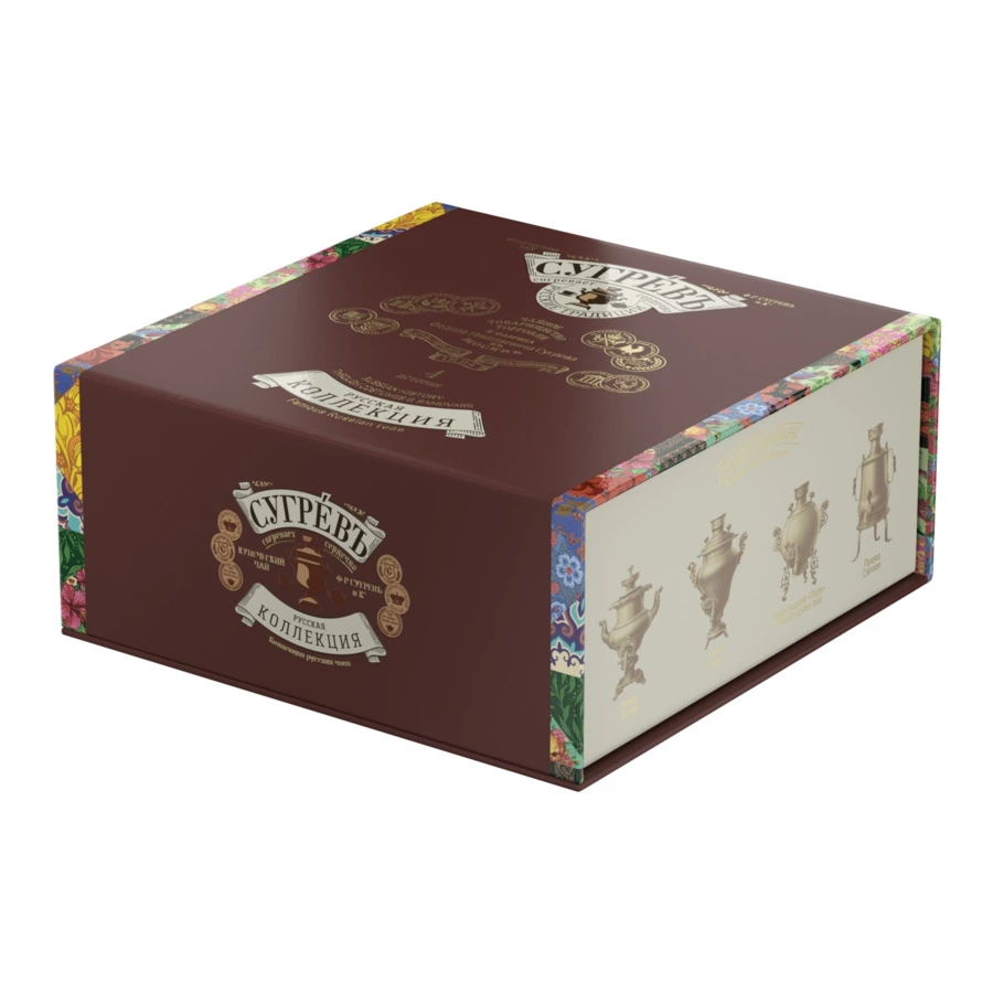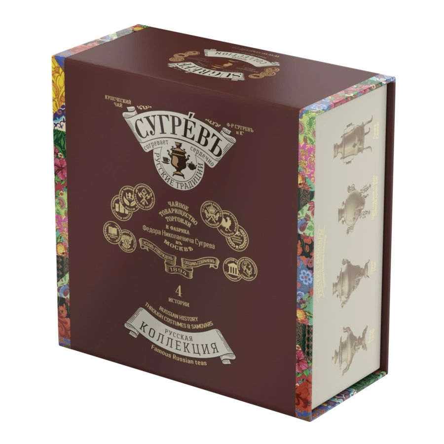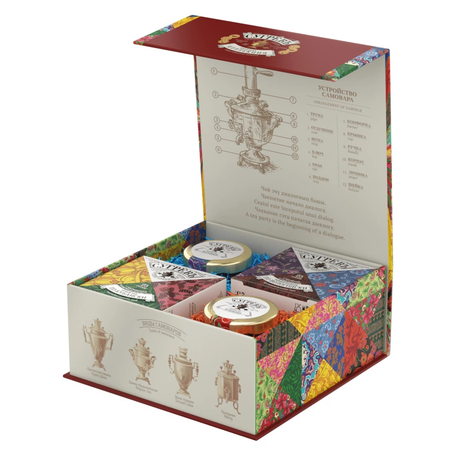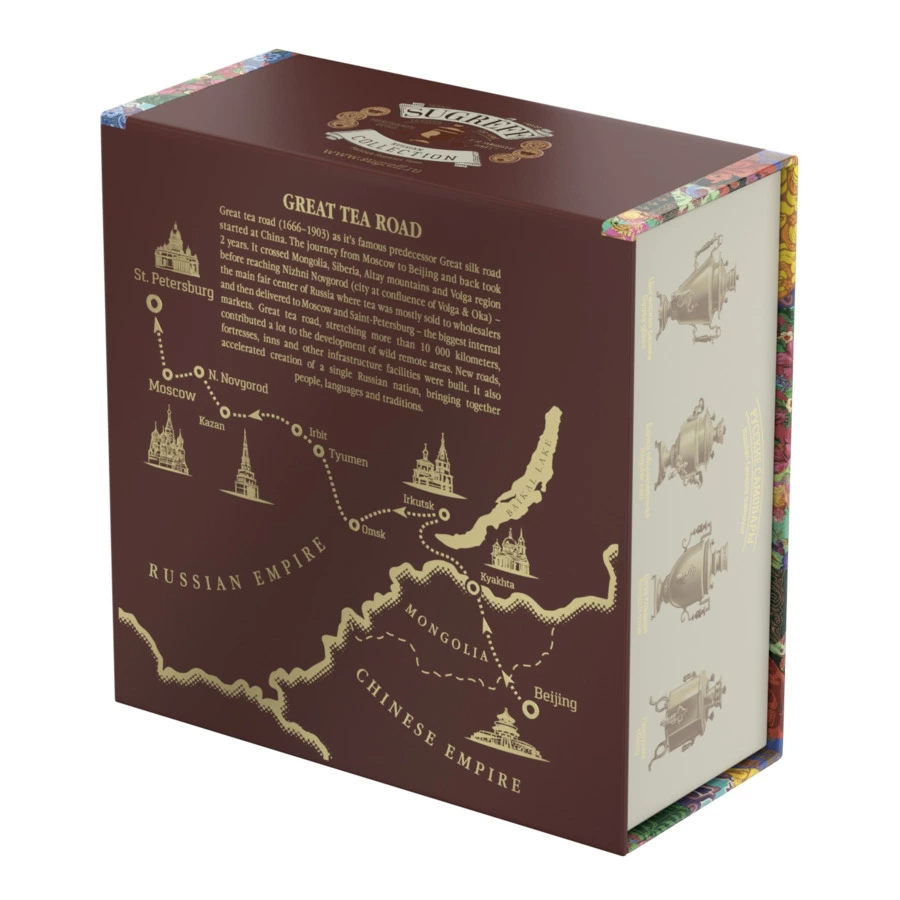 Подарочный набор из двух эксклюзивных купажей листового чая характерных для разных регионов России и двух натуральных варений из ягод черники и рябины в сувенирной шкатулке из переплётного картона с магнитным клапаном. Шкатулка содержит подробную схему устройства самовара на русском и английском языках, а также карту Великого чайного пути, по которому доставляли чай из Пекина в Москву и Санкт-Петербург через города Кяхту, Иркутск, Омск, Ирбит, Тюмень, Казань и Нижний Новгород.