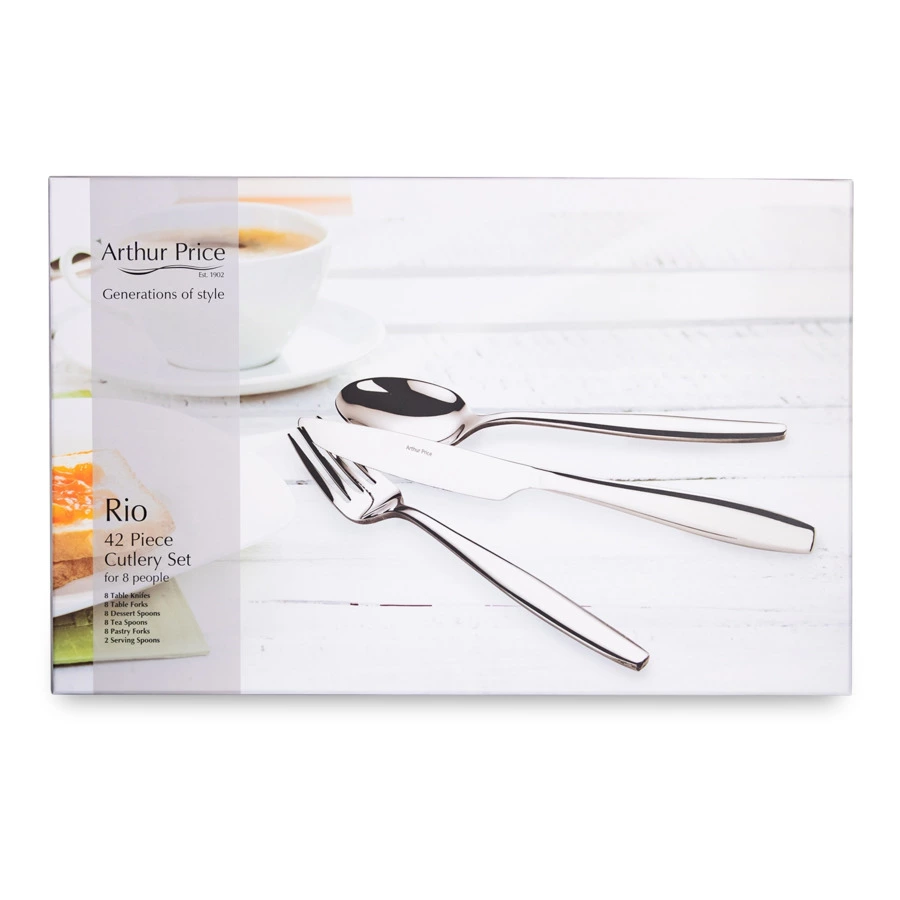 Набор столовых приборов «Рио», рассчитанный на 8 персон, произведен популярным британским брендом Arthur Price, созданным еще в начале XX века. В комплект входит 42 предмета: