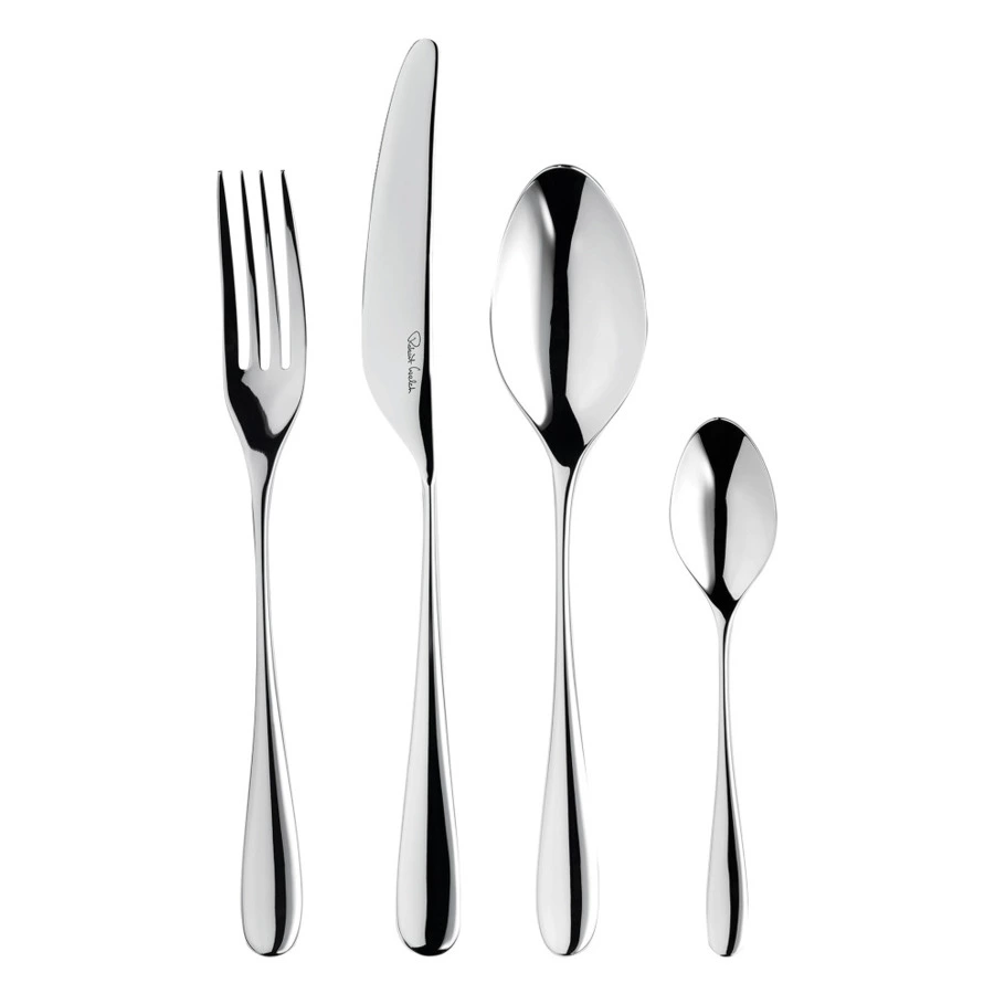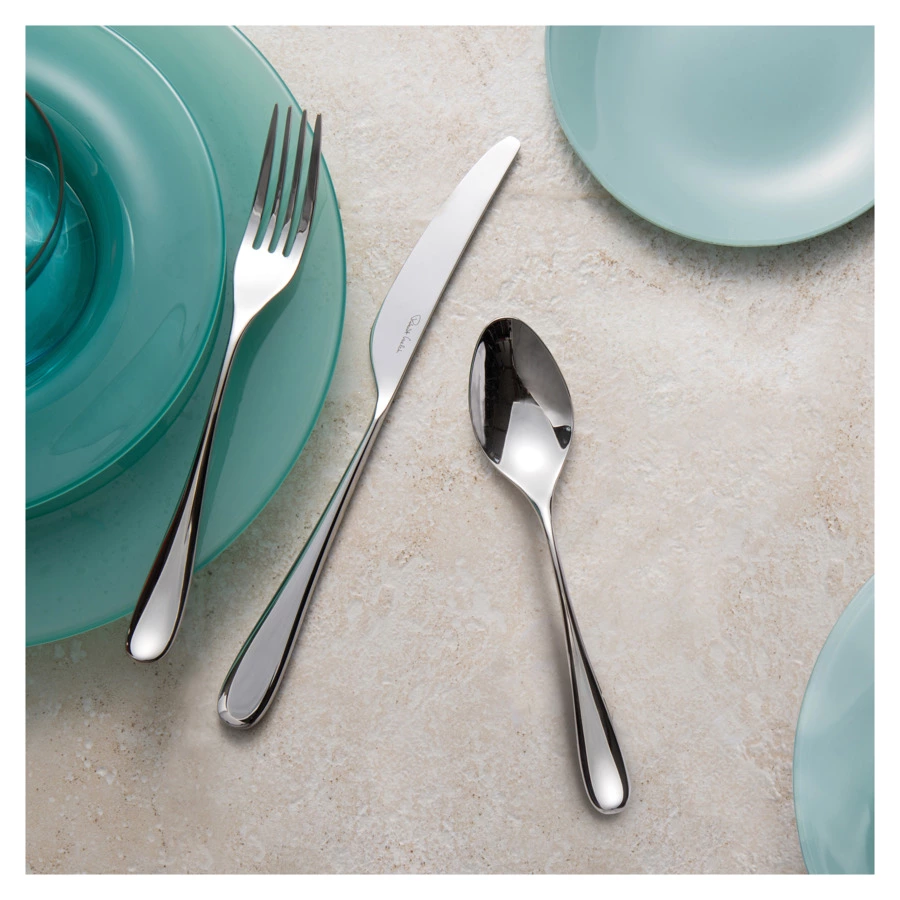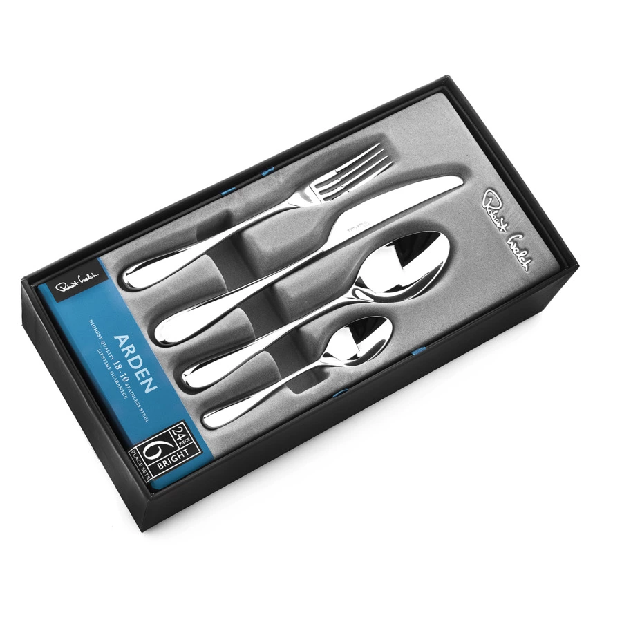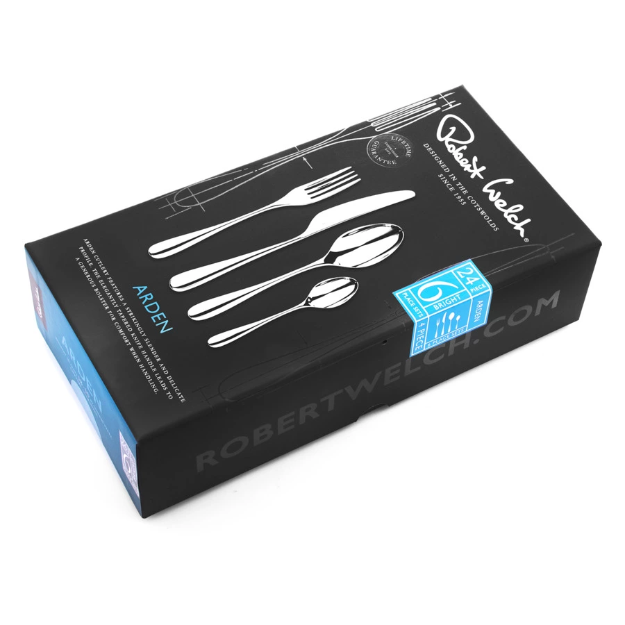 Серия Arden Bright вобрала в себя все идеи и чаяния английского дизайнера. Удивительно обтекаемая форма этих столовых приборов поражает с первого взгляда. Утончённая ножка ложек, вилок и ножей плавно перетекает в верхнюю часть, создавая эффект лёгкости и изящности. Посуда изготовлена из первоклассной нержавеющей стали, закалена в особых условиях и отполирована до зеркального блеска. На каждый прибор нанесён вензель производителя Robert Welch.