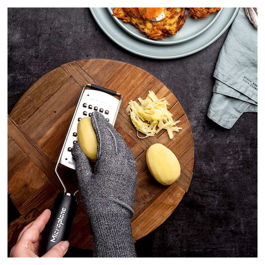 Защитная перчатка Microplane которая подойдёт для правшей и левшей. Перчатка защищает кожу от лезвий и устойчива к порезам. Можно стирать в стиральной машине.