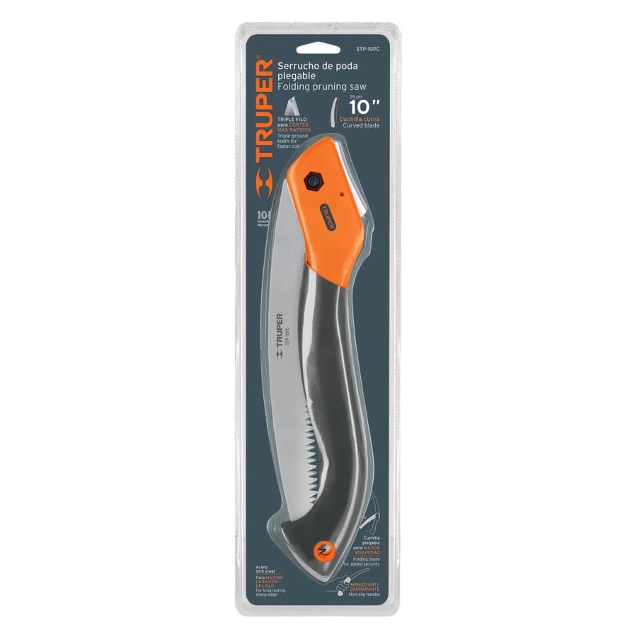 Складная пила Truper STP-10PC с эргономичной рукояткой из пластика — идеальный выбор для профессионалов и любителей садоводства. Благодаря высококачественному стальному лезвию SK5 с трёхгранной заточкой, эта пила обеспечивает быстрый и точный рез.