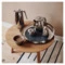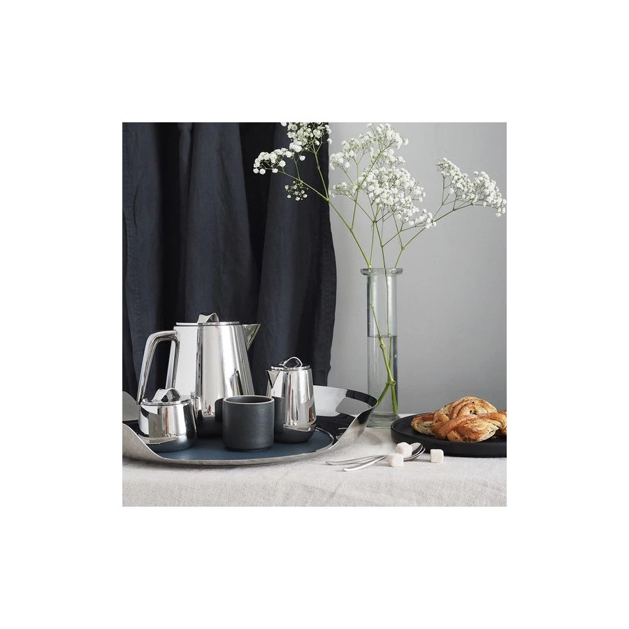Поднос бренда Georg Jensen, основанного Георгом Йенсеном в Дании, изготовлен из качественной нержавеющей стали. Такой материал отличается прочностью и долговечностью. Изделие отполировано до зеркального блеска. Поднос обладает двумя удобными ручками и нескользящей поверхностью, что гарантирует устойчивость чашек и других предметов. Дизайн коллекции «Хеликс» специально для марки разработало дизайнерского агентство Bernadotte & Kylberg. В серию также вошли кофейник, чайный кувшин, молочник и сахарница.