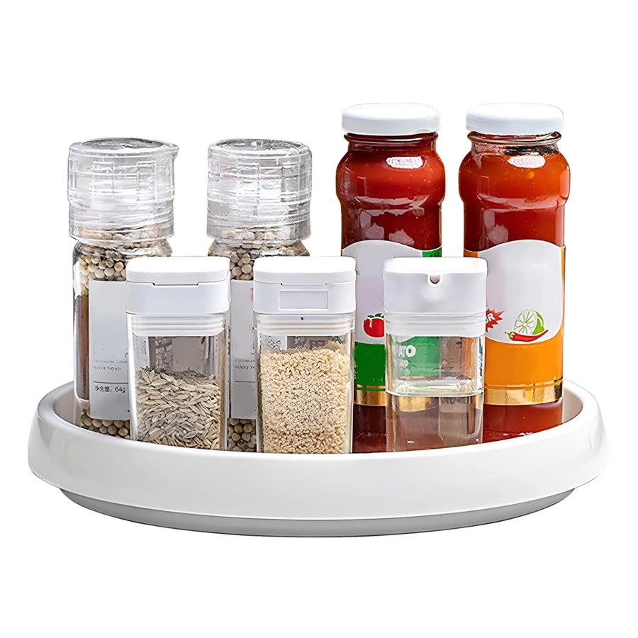 Стильный и функциональный вращающийся поднос для кухни станет прекрасным аксессуаром для организации пространства в вашем доме. Вращающийся поднос изготовлен из безопасного пластика и может быть использован как фруктовница, подставка для специй, кухонный органайзер для хранения кухонной утвари и кухонных принадлежностей.