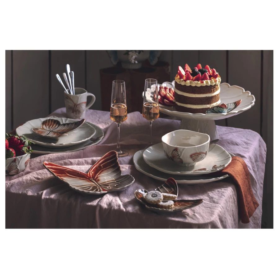 «Облачные бабочки» – новая линейка бренда Bordallo Pinheiro, созданная по авторским рисункам Клаудии Шиффер. Культовая супермодель разработала дизайн собственной серии сервировочной посуды и интерьерного декора, вдохновляясь природой сельской местности. Коллекция сохранила узнаваемую природную стилистику португальской компании. Она получилась нежной, романтичной, чувственной. Каждый предмет украшен изображениями или объёмными фигурками красочных насекомых. Оригинальные изделия придадут сервировке атмосферу летнего сада, пасторальную свежесть и безмятежность.