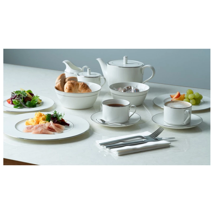Коллекция «Белый жемчуг» от японского бренда Narumi — истинное воплощение ремесленных традиций Востока: лаконичные формы, изящные линии. Главная особенность — это нежный паттерн, который напоминает перламутровую россыпь в деликатной платиновой окантовке. В серии представлены: обеденные и закусочные тарелки, салатники, чайная пара, сахарница, молочник, заварочный чайник. Все предметы изготовлены из тончайшего фарфора. Посуда украшается мастерами вручную.