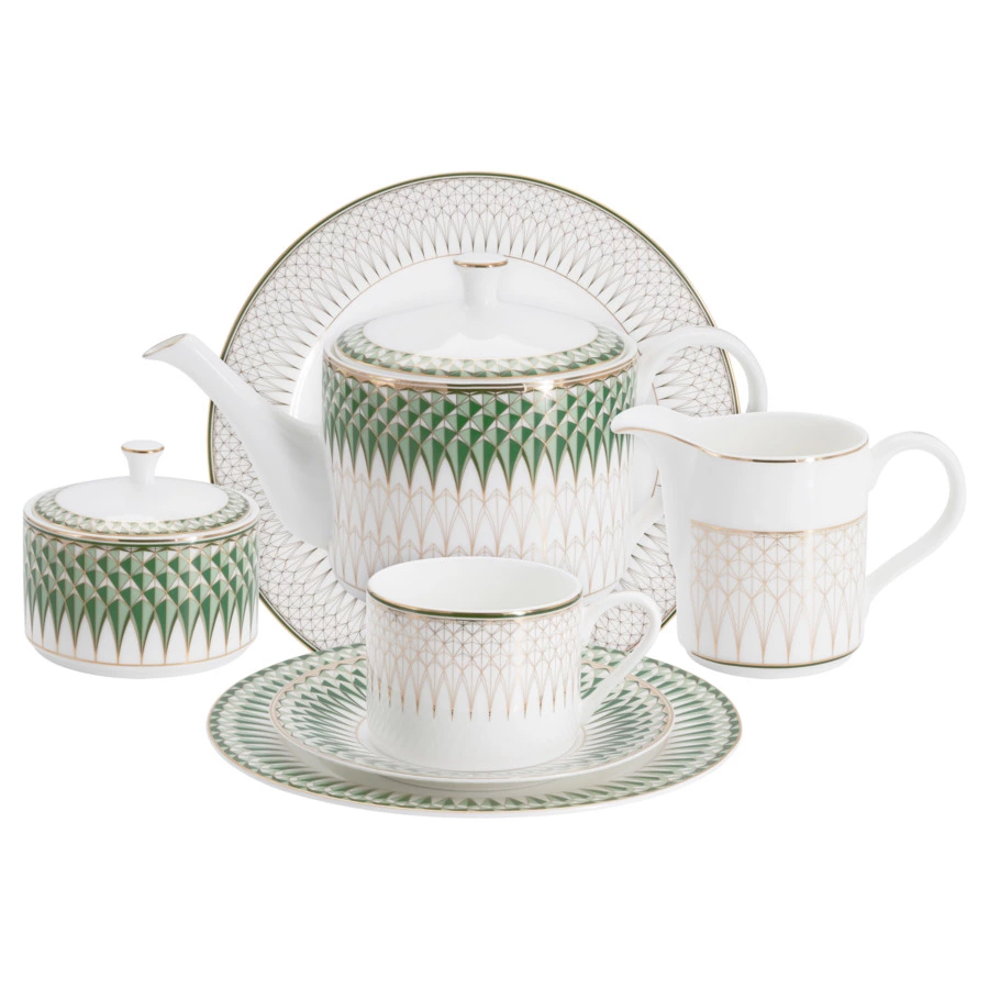 Орнамент золотого цвета, напоминающий огранку драгоценных камней с добавлением различных оттенков зелёного на некоторых предметах на тонком костяном фарфоре — воплощение поистине царского великолепия!